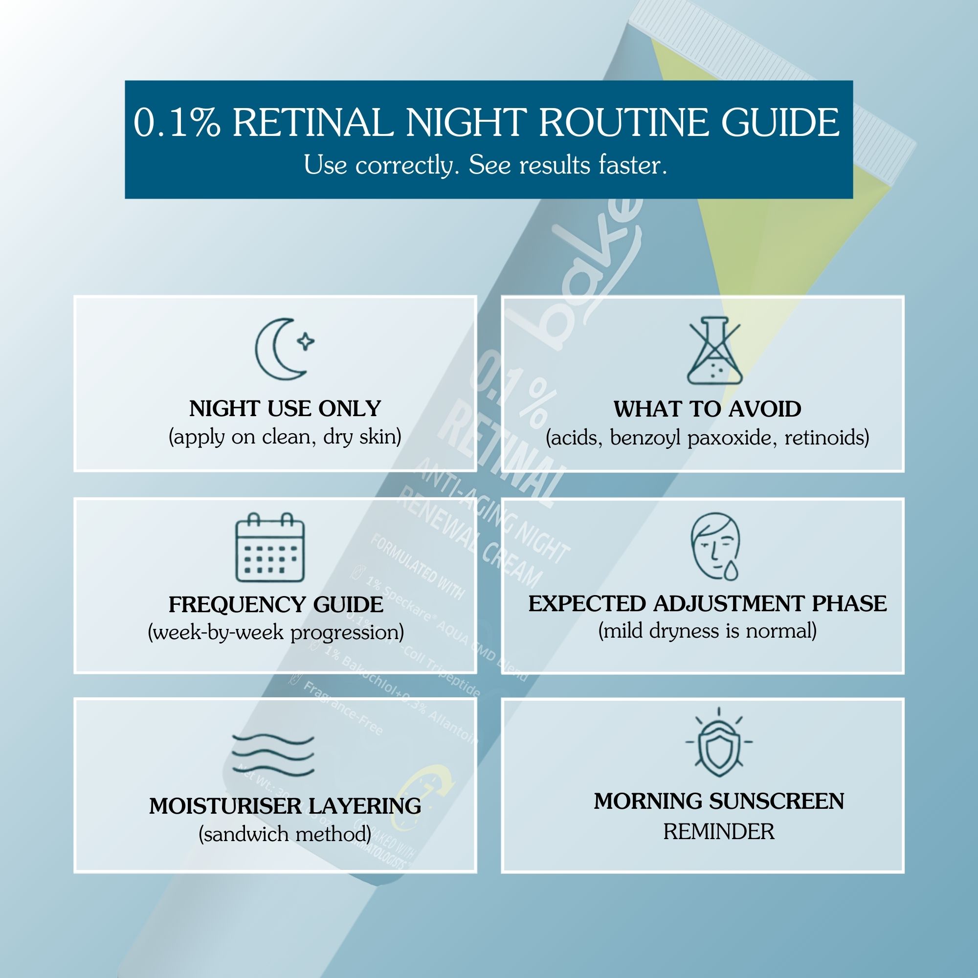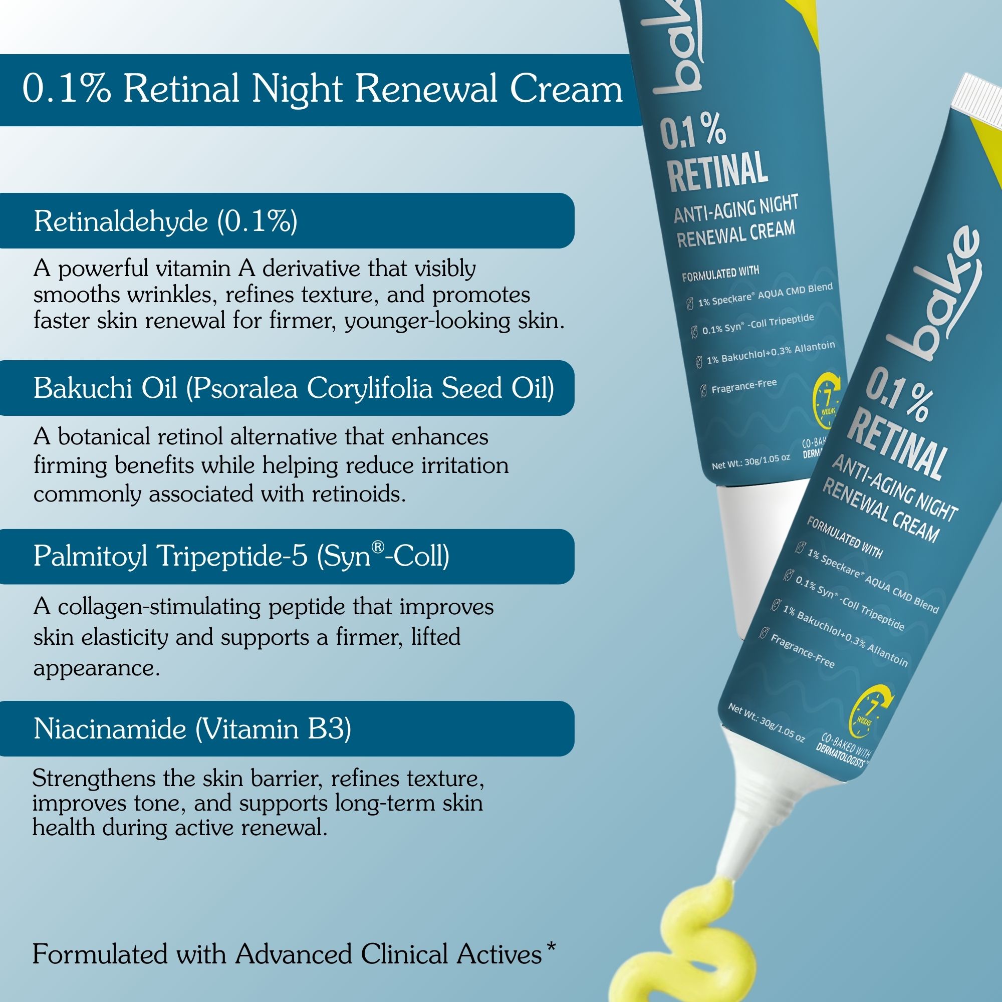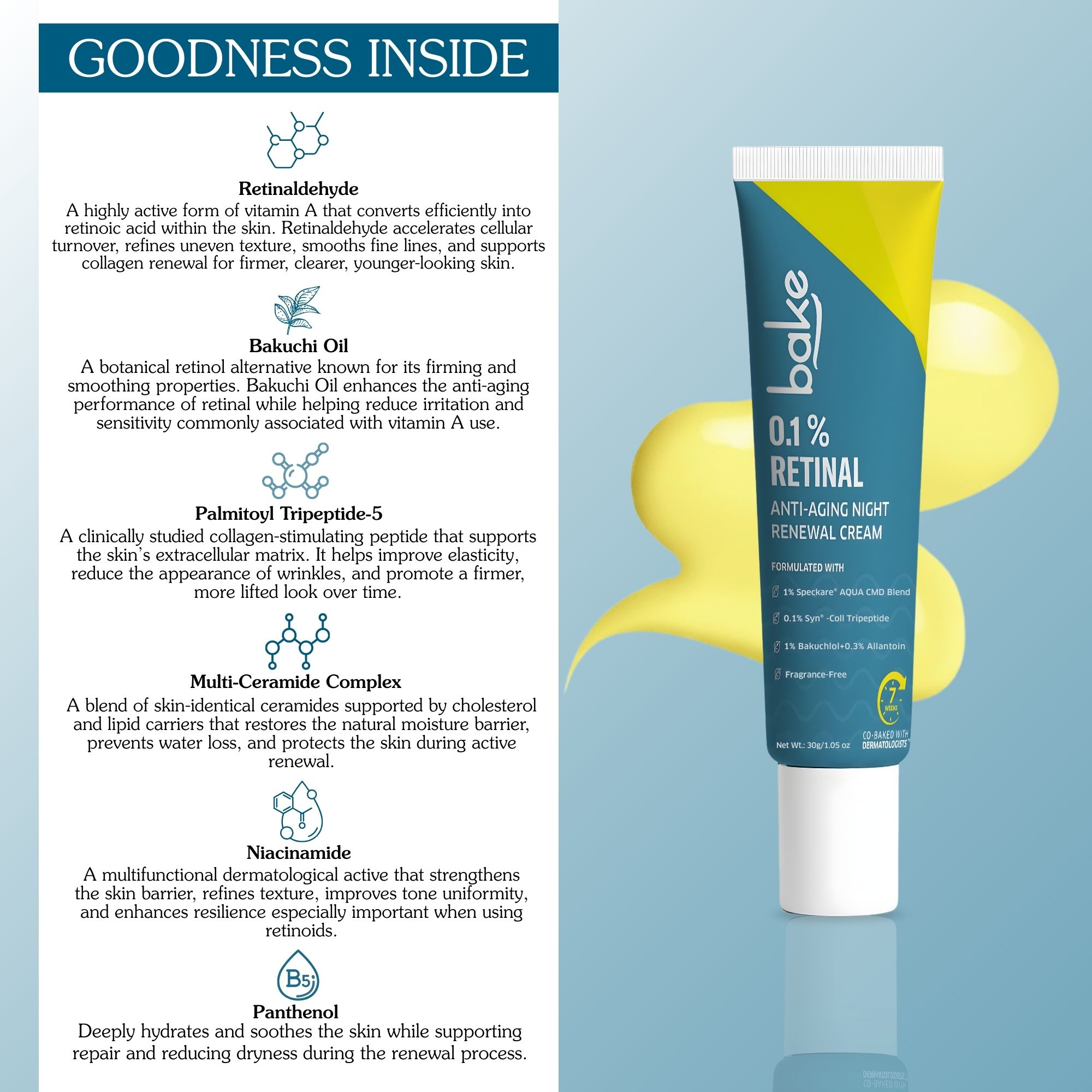 RETINALDEHYDE, NOT RETINOL - FASTER, MORE POWERFUL RESULTS: Formulated with 0.1% Retinaldehyde (Retinal), a superior Vitamin A derivative that converts to retinoic acid in just one step - making it up to 11x more potent than retinol. Nano-sized to 0.00005mm and stabilized via liposome technology for deeper skin penetration and accelerated cell renewal. TRIPLE ANTI-AGING ACTION WITH BAKUCHI OIL + PEPTIDE + CERAMIDES: Combines 1% Bakuchiol (botanical retinol booster), 0.1% Palmitoyl Tripeptide-5 (collagen-stimulating peptide), and a Multi-Ceramide Complex to visibly firm skin, reduce wrinkles, restore the moisture barrier, and support long-term skin elasticity - all in one cream. BARRIER-SUPPORTIVE FORMULA DESIGNED TO MINIMIZE IRRITATION: Enriched with 4% Niacinamide, 0.3% Allantoin, Panthenol, Olive Squalane, and Shea Butter to strengthen the skin barrier, lock in moisture, and reduce the dryness or sensitivity typically associated with retinoid use - making it suitable even for those new to retinal. TRANSPARENT INGREDIENT CONCENTRATIONS - UNFILTERED HONESTY: Every active is listed with its exact concentration - 4% Niacinamide, 1% Bakuchiol, 1% Speckare AQUA CMD Blend, 0.3% Allantoin, 0.1% Retinaldehyde, and 0.1% SYN-Coll - so you know exactly what you're putting on your skin, with no hidden fillers or marketing fluff. DERMATOLOGIST CO-CREATED | FRAGRANCE-FREE | PM USE ONLY: Developed in collaboration with dermatologists and formulated without added fragrance for sensitive skin compatibility. Apply nightly on clean, dry skin. Avoid combining with acids, benzoyl peroxide, or other retinoids. Always follow with SPF in the morning for best results.
