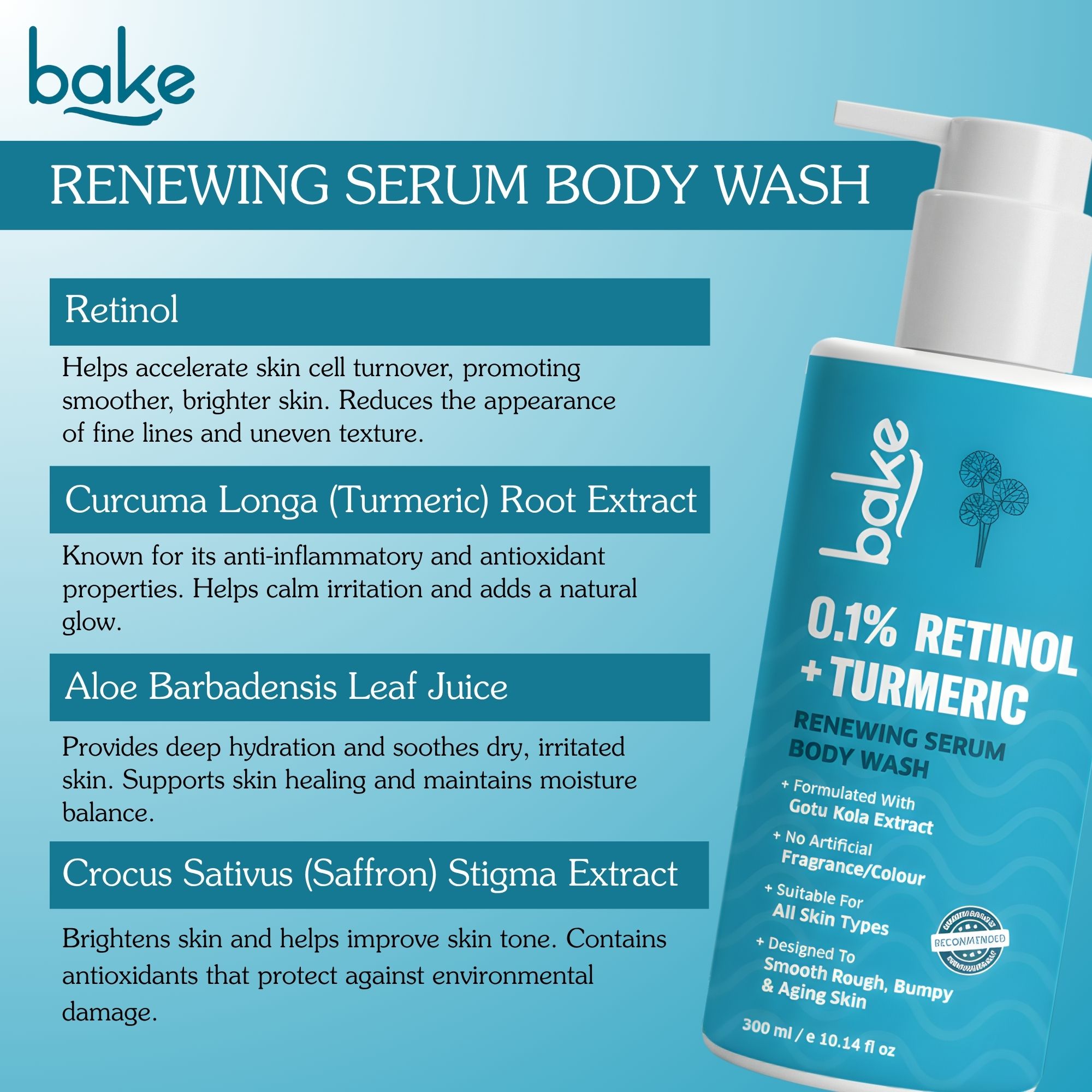 Targets Rough & Bumpy Skin Texture: Specially designed to smooth uneven and bumpy skin, this body wash works effectively on areas like arms, thighs, and back. The active ingredients gently exfoliate dead skin buildup and refine texture over time. With regular use, skin feels noticeably softer, clearer, and more even. Anti-Aging Body Care Solution: Powered by Retinol, this formula helps reduce visible signs of aging such as fine lines, dullness, and loss of elasticity. It promotes healthier-looking skin by boosting renewal and improving firmness. Ideal for maintaining youthful, radiant skin across the body. Deep Cleansing Without Drying: This serum-based body wash deeply cleanses dirt, oil, and impurities from the skin without stripping away natural moisture. Its gentle formulation ensures your skin stays hydrated and comfortable after every wash. Perfect for daily use without causing dryness or irritation. Enhances Natural Skin Glow: The combination of Retinol and Turmeric works synergistically to revive dull skin and enhance natural brightness. It helps improve overall complexion, making skin look fresh, radiant, and full of life. Consistent use reveals a healthy, glowing finish. Lightweight Serum-Based Formula: Unlike regular body washes, this product features a serum-like texture that penetrates deeply into the skin. It delivers active ingredients effectively while providing a luxurious cleansing experience. Leaves skin feeling smooth, nourished, and revitalized.