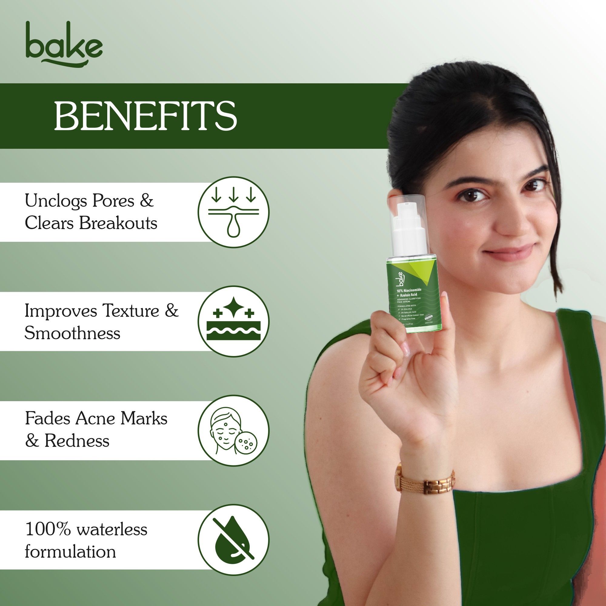 Controls Active Acne: Formulated with 10% Niacinamide and Azelaic Acid, our serum effectively targets active acne by reducing inflammation and inhibiting the growth of acne-causing bacteria, promoting clearer skin.Fades Acne Marks: BAKE 10% Niacinamide + Azelaic Acid Face Serum includes potent blend of Kojic Acid and Rice Water, which work synergistically to lighten pigmentation caused by acne, gradually fading acne marks for a clearer & brighter complexion.