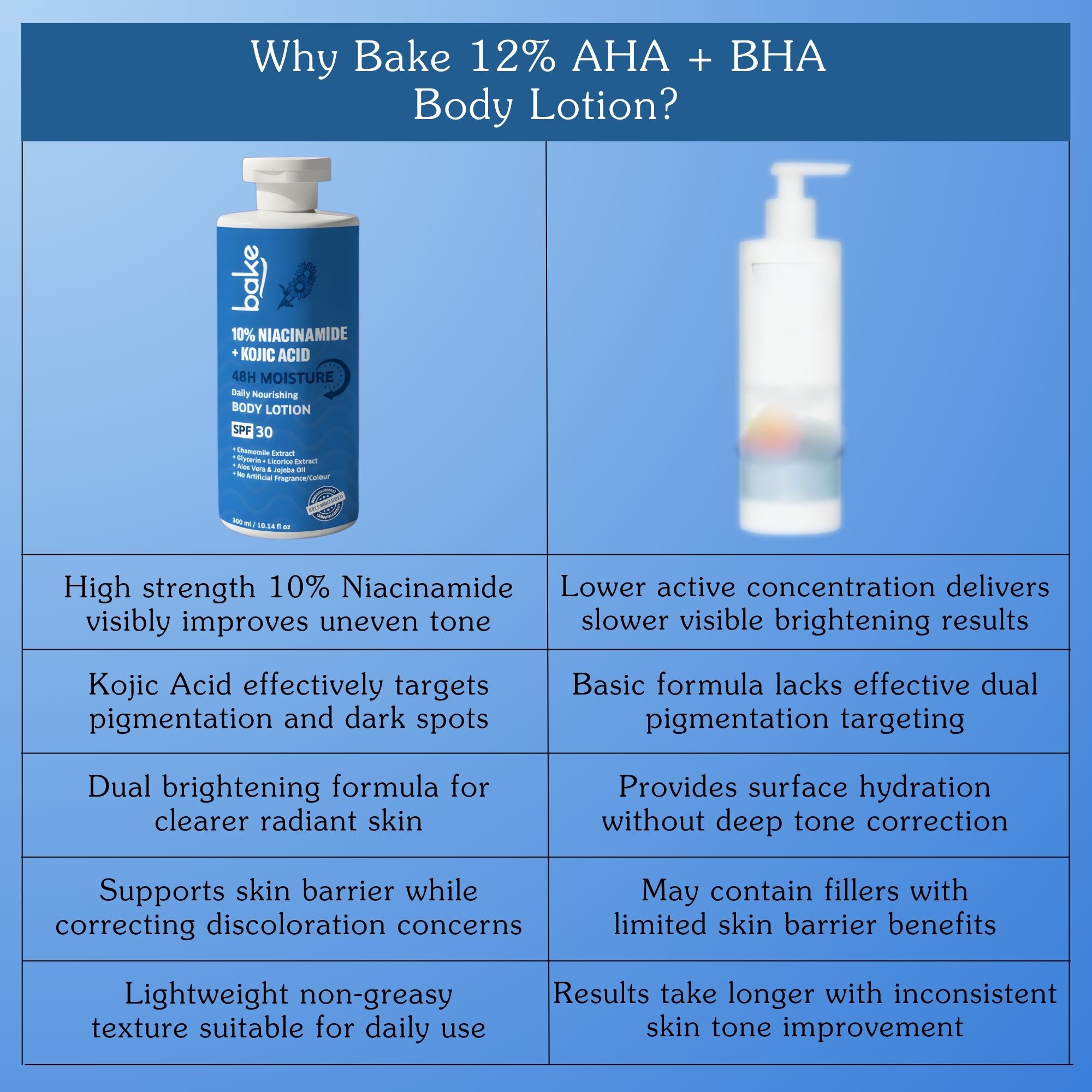 TAN REMOVAL : BAKE 10% Niacinamide Body Lotion SPF 30 helps in tan removal by utilizing kojic acid, which breaks down excess melanin, and SPF 30 to prevent further tanning, restoring your skin's natural tone.