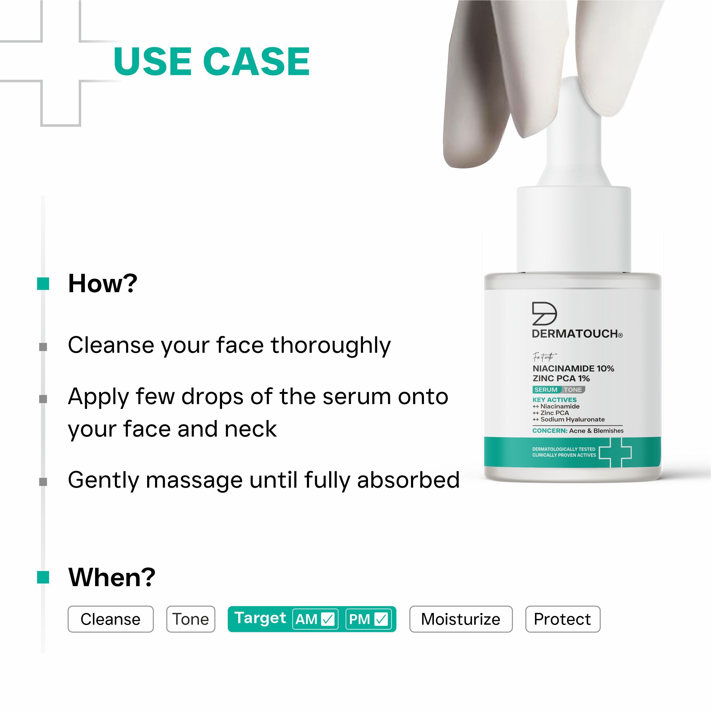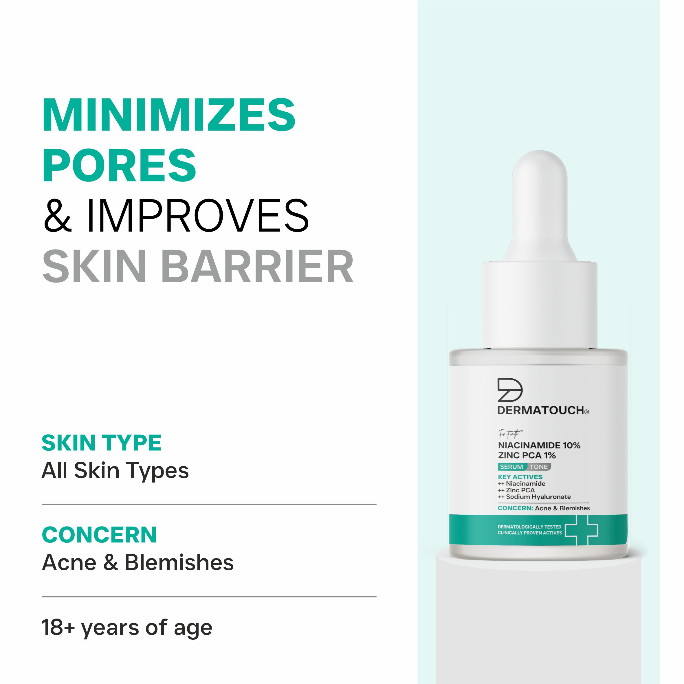 DERMATOUCH Niacinamide 10% Zinc PCA 1% Serum is a potent formula designed to reduce acne, controls excess oil and minimizes pores. Infused with 10% Niacinamide, this serum effectively fades dark spots, giving more even, radiant complexion. The addition of 1% Zinc PCA provides anti-inflammatory benefits, helps combat acne and balances sebum levels to prevent breakouts.