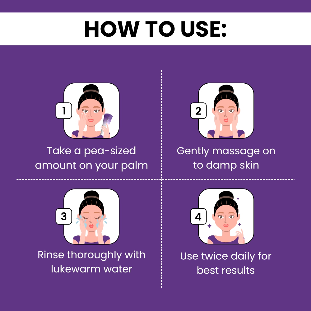 1. Moisten face with water2. Take a small quantity of deep cleansing face wash on the palm 3. Apply using a gentle circular motion 4. Rinse well