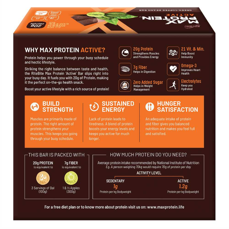 Max Protein Green Coffee Beans is made for all the coffee lovers who love a perfect start to their day. This 100% vegetarian bar consists of 21 vital Vitamins & Minerals, Electrolytes, Omega 3, Amino Acid (L-Glutamine). It has high protein (20gm) and fiber (7gm) to keep you energized. It's prebiotic in nature and even helps you keep your hunger in check for 3 hours.