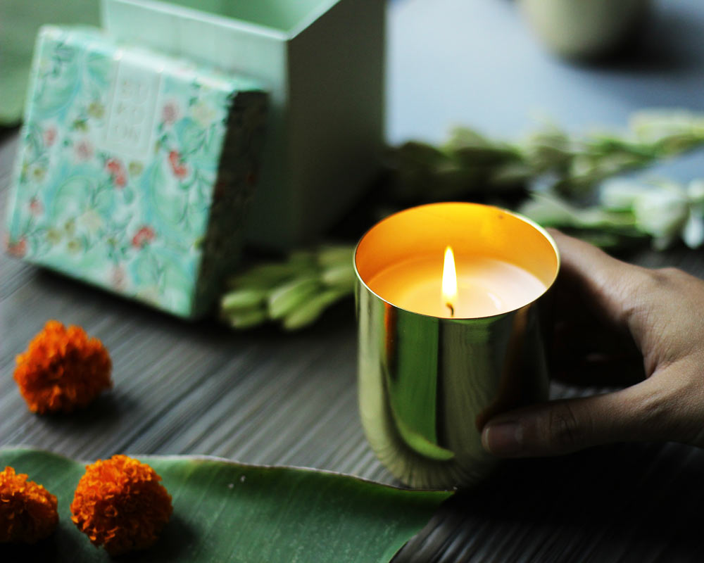 Infuse your house with the sultry aroma of Floral Oud. Alama candle aims to ignite the senses through scent. The Floral Oud candle which imparts the intensely elegant essence of agarwood, and Flowers blossom around a room doubles as an ornament thanks to its handmade brass vessel. Place it in the centre of your well-curated coffee table and watch as it ties the room together with both scent and design.