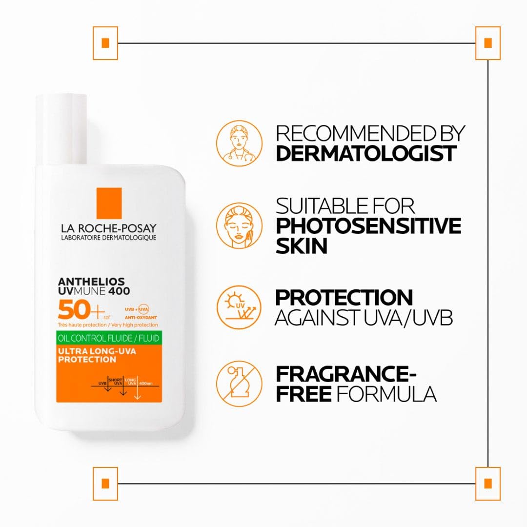La Roche-Posay Anthelios Uvmune 400 Oil Control Spf 50+ Is A High-Performance Sunscreen Fluid Specially Formulated For Oily And Sensitive Skin. It Offers Very High Uva And Uvb Protection, Shielding The Skin From Harmful Rays, Including Ultra-Long Uva Rays That Penetrate Deep Into The Skin And Cause Cellular Damage. Its Oil Control Technology Absorbs Excess Sebum, Keeping The Skin Matte And Fresh Throughout The Day. The Lightweight, Non-Greasy Fluid Is Water, Sweat, And Sand Resistant, Making It Perfect For Daily Use And Outdoor Activities. Enriched With Soothing And Antioxidant Ingredients Like Tocopherol And Bixa Orellana Seed Extract, It Protects Against Oxidative Stress While Being Gentle On Sensitive Skin. The Formula Is Designed To Be Anti-Eye Stinging, Ensuring Comfort Even Around The Delicate Eye Area. With Easy Application And Fast Absorption, It Leaves The Skin Feeling Smooth, Soft, And Shine-Free. This 50Ml Sunscreen Is An Essential Step In Your Skincare Routine For Long-Lasting Protection And Healthy, Balanced Skin.
