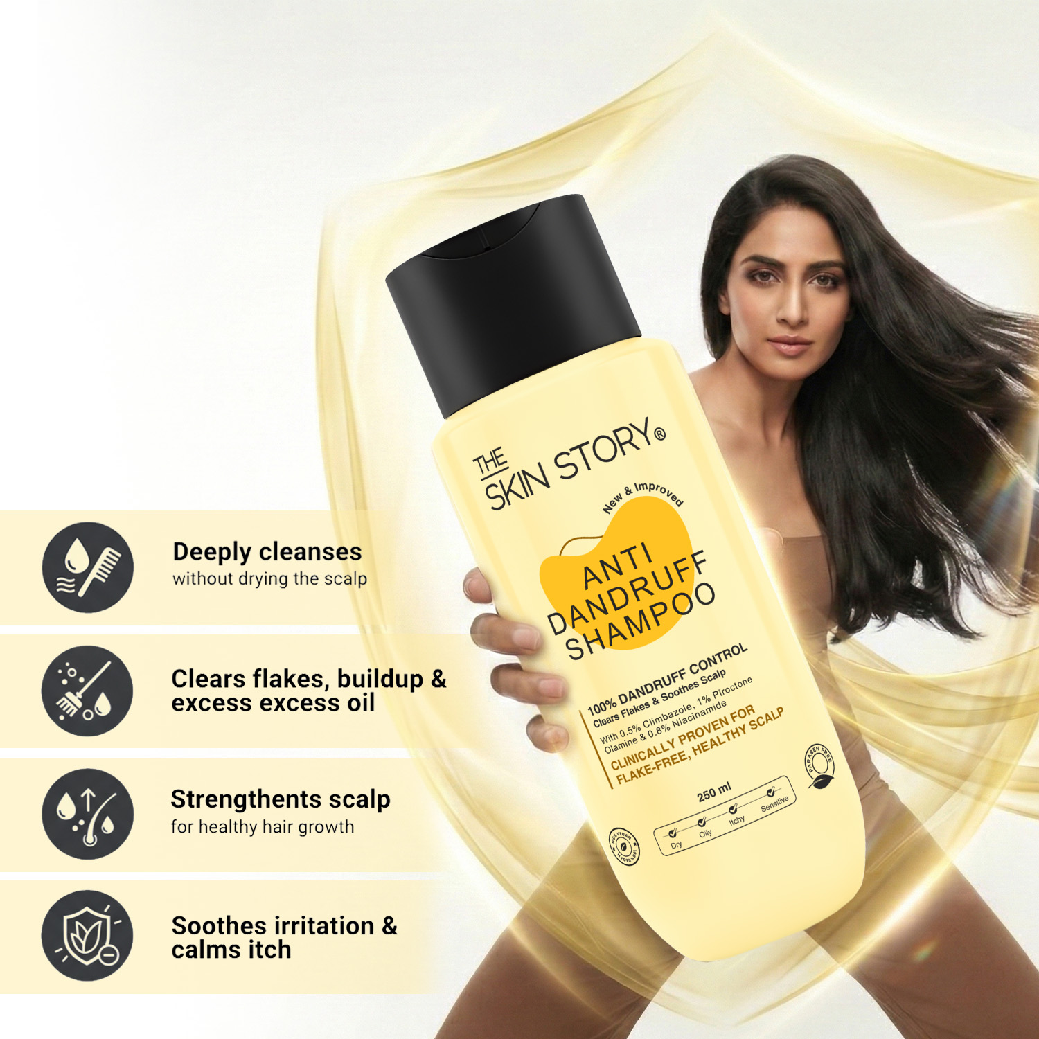 The Skin Story Anti Dandruff Shampoo is a 3 in 1 shampoo, which deeply cleanses, controls dandruff and calms the itchy scalp. Enriched with powerful ingredients like Saniscalp®, Fucogel and Argan Oil, this shampoo deeply cleanses and moisturises your hair.