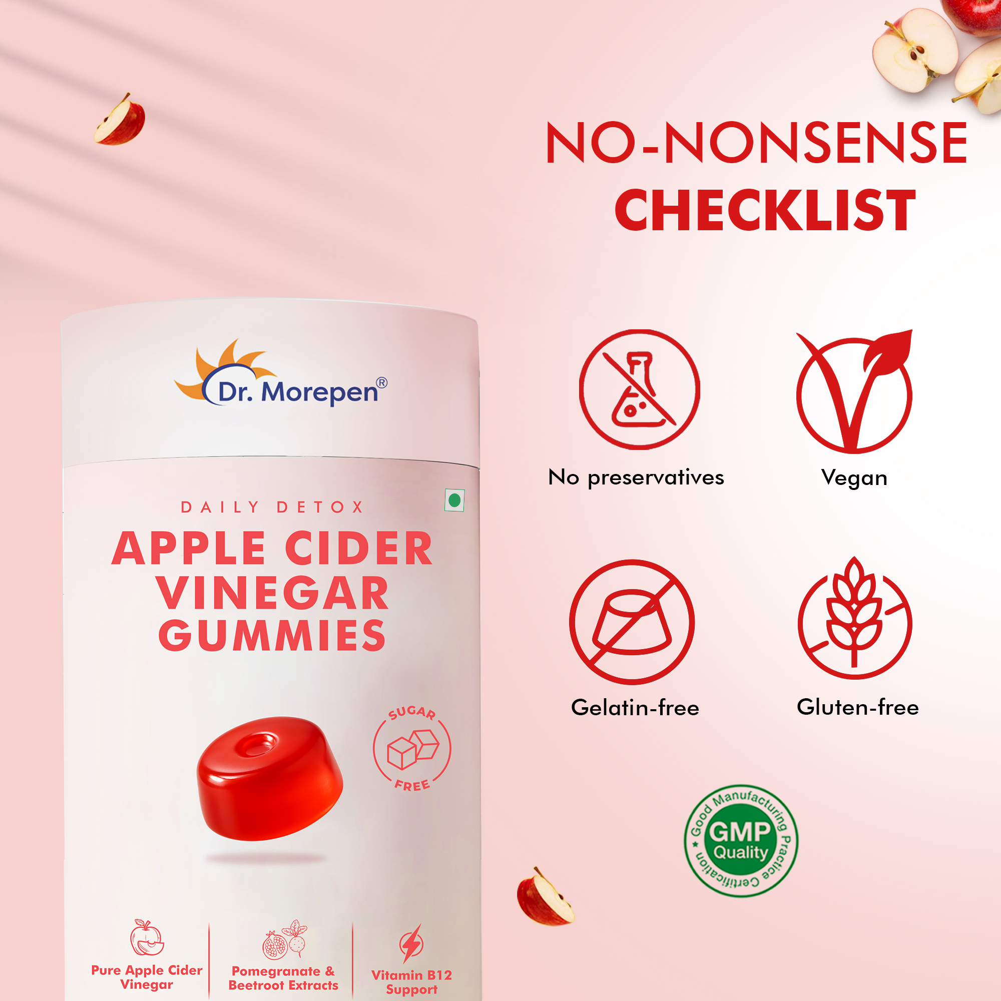 Dr. Morepen delicious Apple Cider Vinegar Gummies deliver the wellness benefits of natural ACV in a convenient, tasty format, supporting healthy digestion, metabolism, and overall gut health. Perfect for daily wellness and weight management goals, they offer a tangy-sweet flavor without the harsh acidity of liquid ACV. Made under strict quality standards in a state-of-the-art facility, they provide a safe, effective, and enjoyable way to maintain a cleaner, healthier lifestyle.