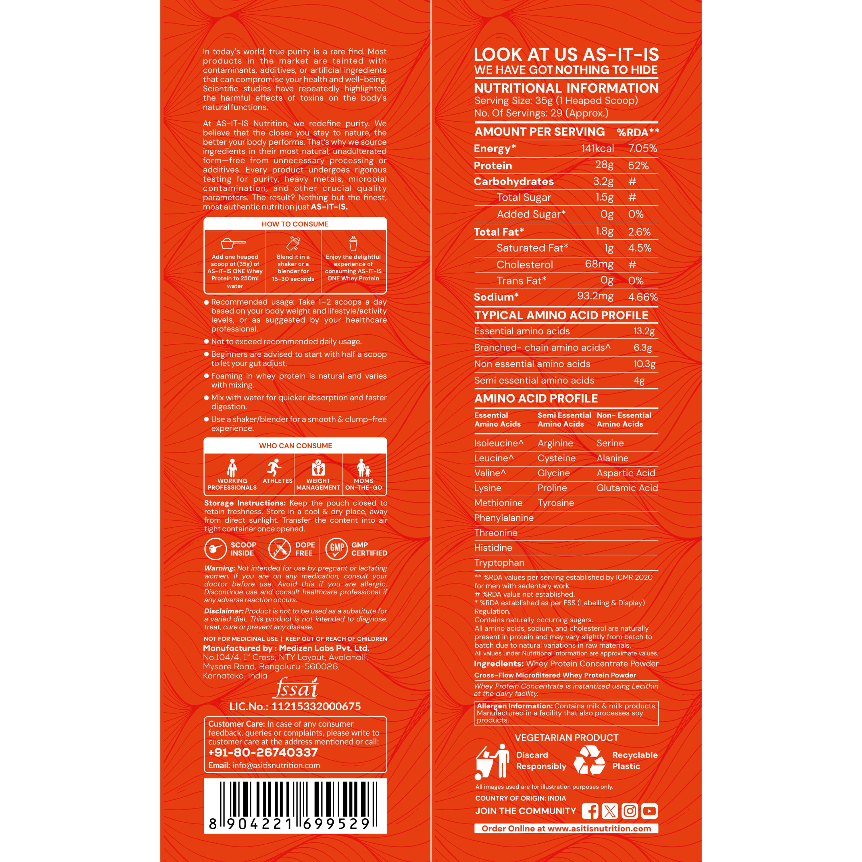 ONE INGREDIENT, ZERO FLUFF: AS-IT-IS ONE Whey Protein Concentrate is a high-impact protein source delivering 28g of clean, complete protein, 6.3g BCAA and 13.2g essential amino acids per 35g scoop. No sugar, no fillers, no amino spiking. Just pure nutrition from a GMP-certified facility, and Labdoor-tested for accuracy.
