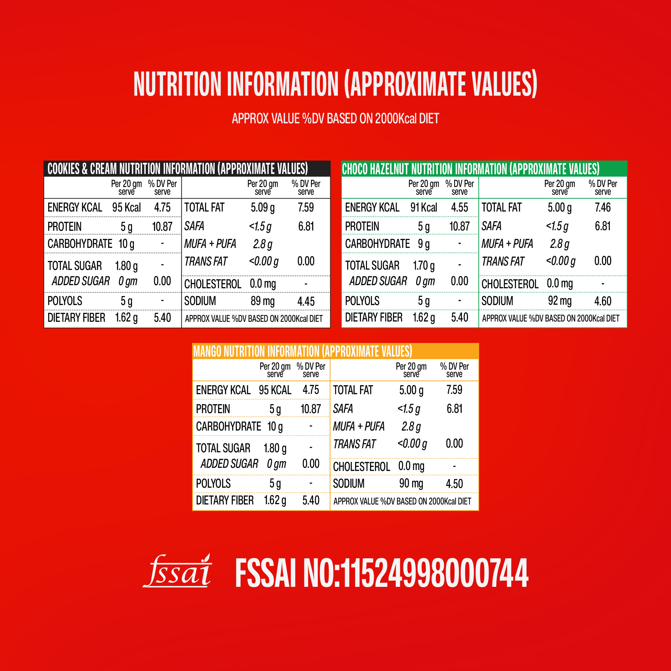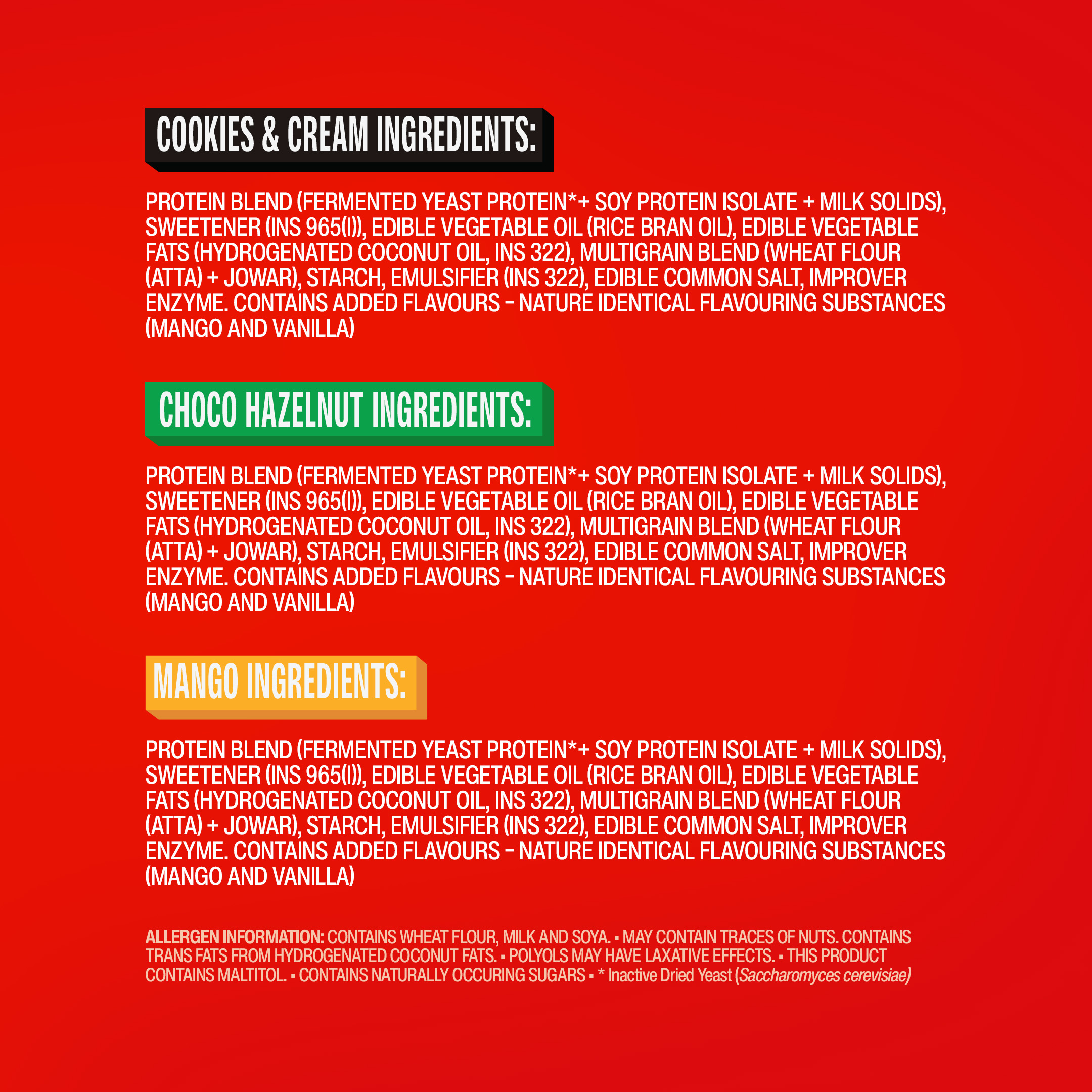 Mango - Protein Blend (Fermented Nutritional Yeast Protein + Soy Protein Isolate + Milk Solid),Sweetener (INS 965 (i)),Edible Vegetable Oil (Rice Bran Oil), Edible Vegetable Fats ( Hydrogenated Coconut oils, INS322), Multigrain Blend (Wheat Flour (Atta) +