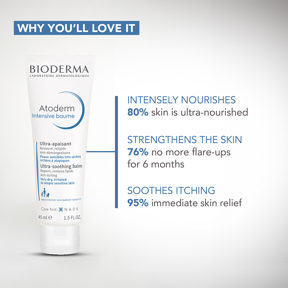 Atoderm Intensive Baume rapidly relieves itching and reduces the urge to scratch. Enriched with soothing agents, this balm calms irritations and durably reconstructs the skin barrier. Makes the skin feel more comfortable and becomes stronger. In a lasting way. Unfragranced. Non sticky. Instant absorption.