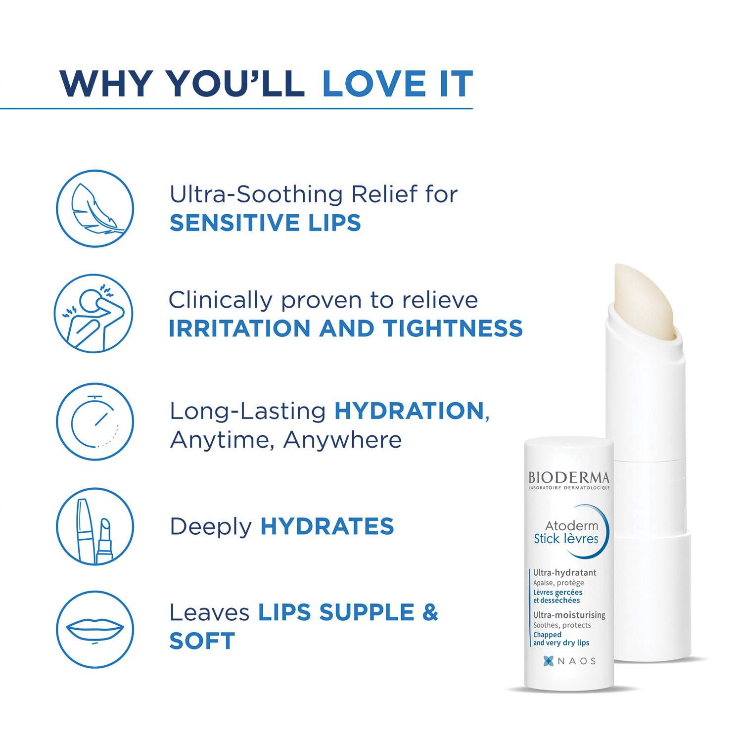 Bioderma Atoderm Lèvres Moisturising Stick is a deeply hydrating lip balm specially formulated to moisturize, repair, and protect dry to very dry lips. Enriched with skin-soothing ingredients, this daily lip care solution provides long-lasting comfort while restoring softness and suppleness.