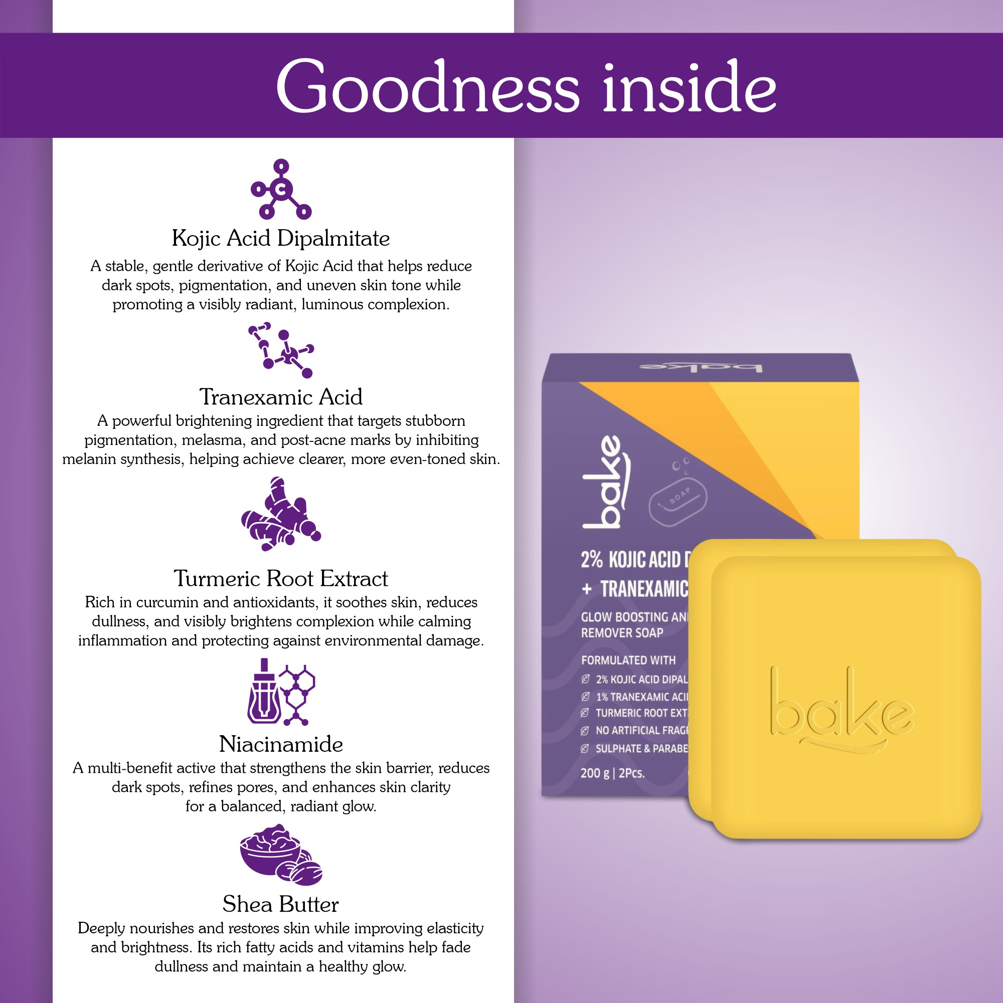 Apply the soap on wet skin and lather gently. Leave on for a few minutes for actives to work. Rinse well with water. For best results, follow with Bake Kojic Body Lotion or Scrub.