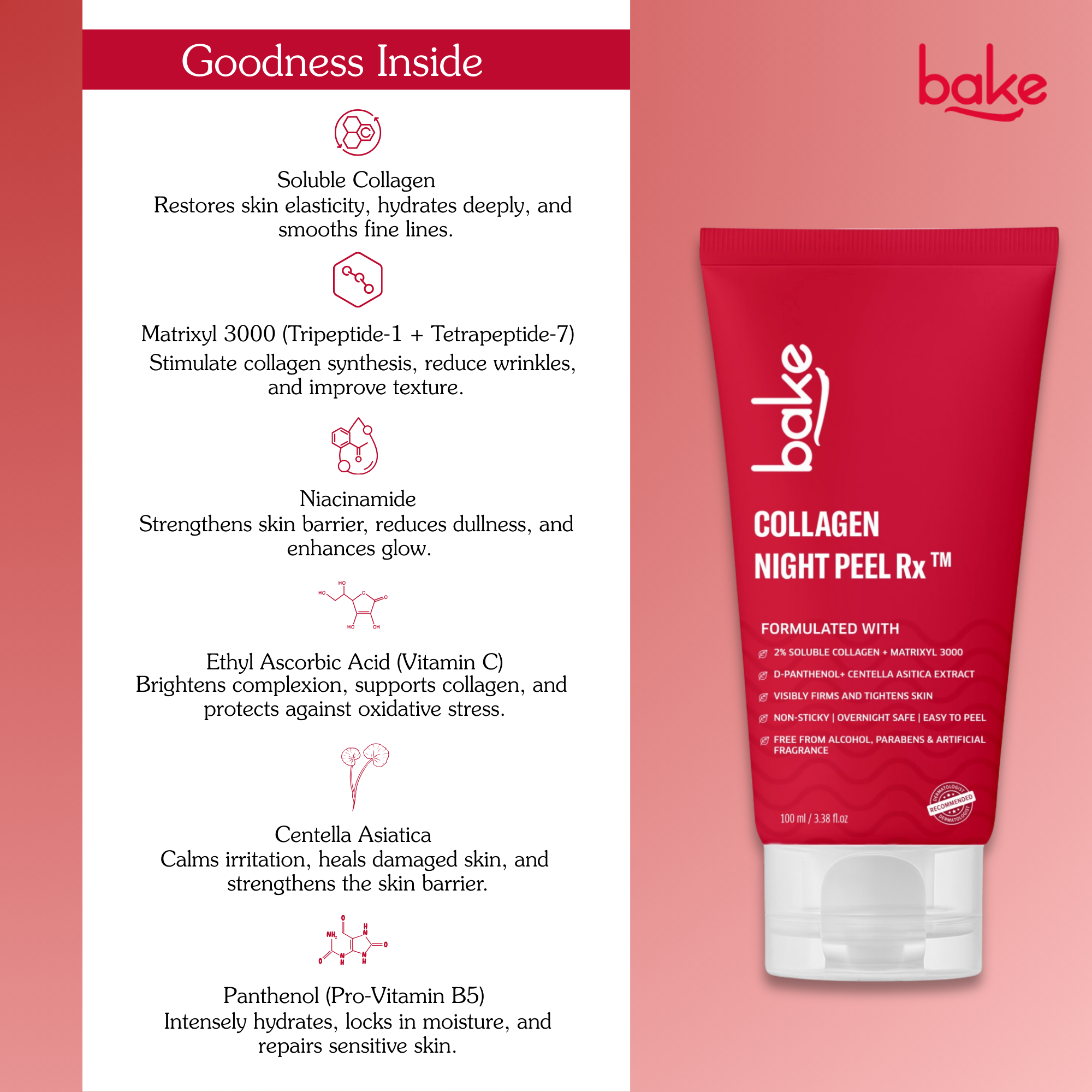 2% Soluble Collagen for Firmness & Elasticity - Deeply hydrates and restores skin elasticity to reduce sagging and fine lines. Helps replenish collagen levels for a plumper, smoother, and more youthful appearance. Matrixyl 3000 for Wrinkle Repair & Texture Renewal - This powerful peptide duo boosts collagen synthesis and improves skin structure. Reduces wrinkles, smooths uneven texture, and visibly tightens skin overnight. Multi-Active Hydration with Niacinamide & Panthenol - Niacinamide brightens and strengthens the barrier, while Panthenol delivers deep moisture. Together, they soothe stressed skin and keep it soft, supple, and nourished. Brightening & Protection with Vitamin C - Ethyl Ascorbic Acid evens skin tone, enhances radiance, and protects against oxidative damage. Helps reveal a naturally glowing, youthful complexion.