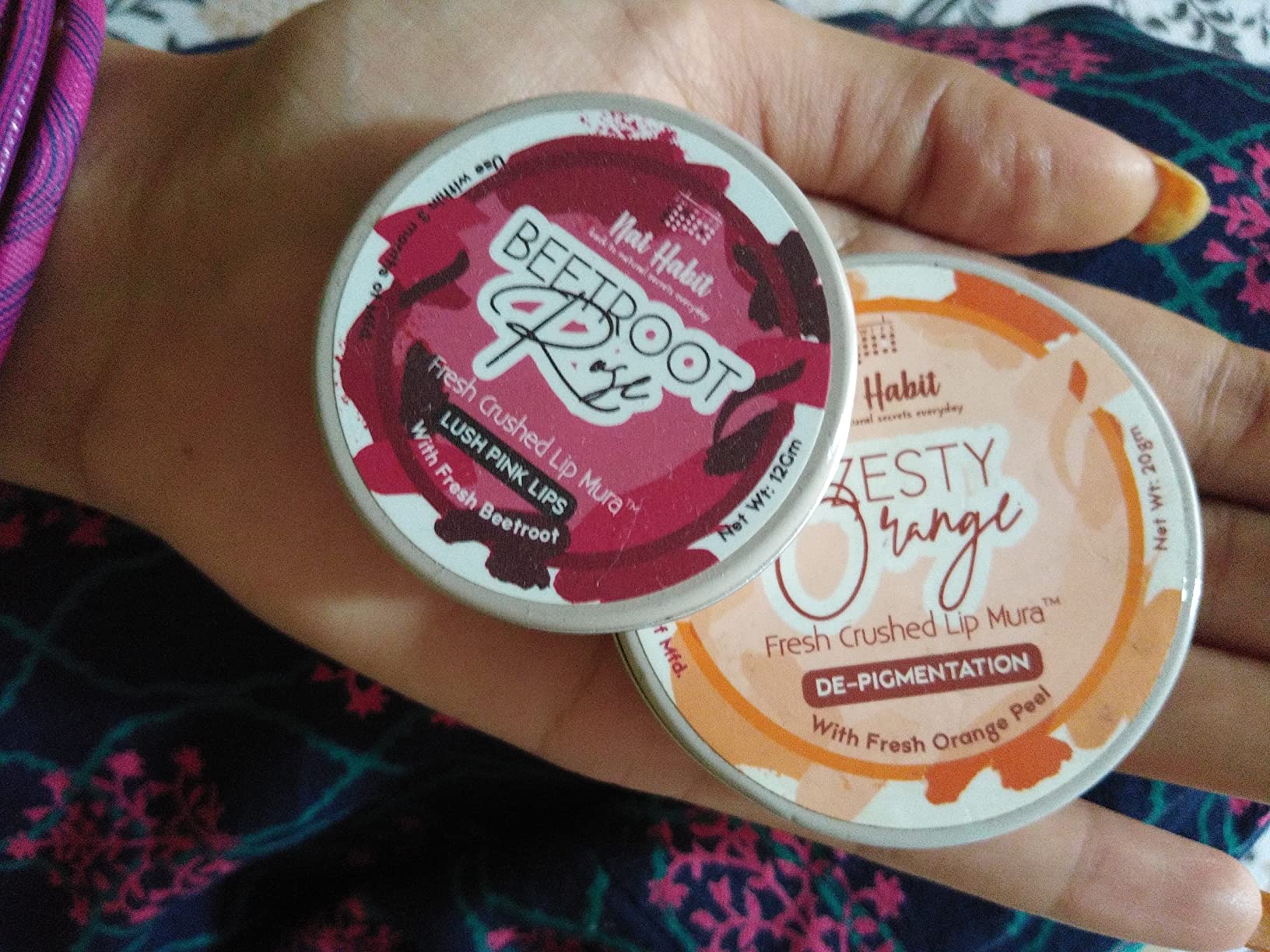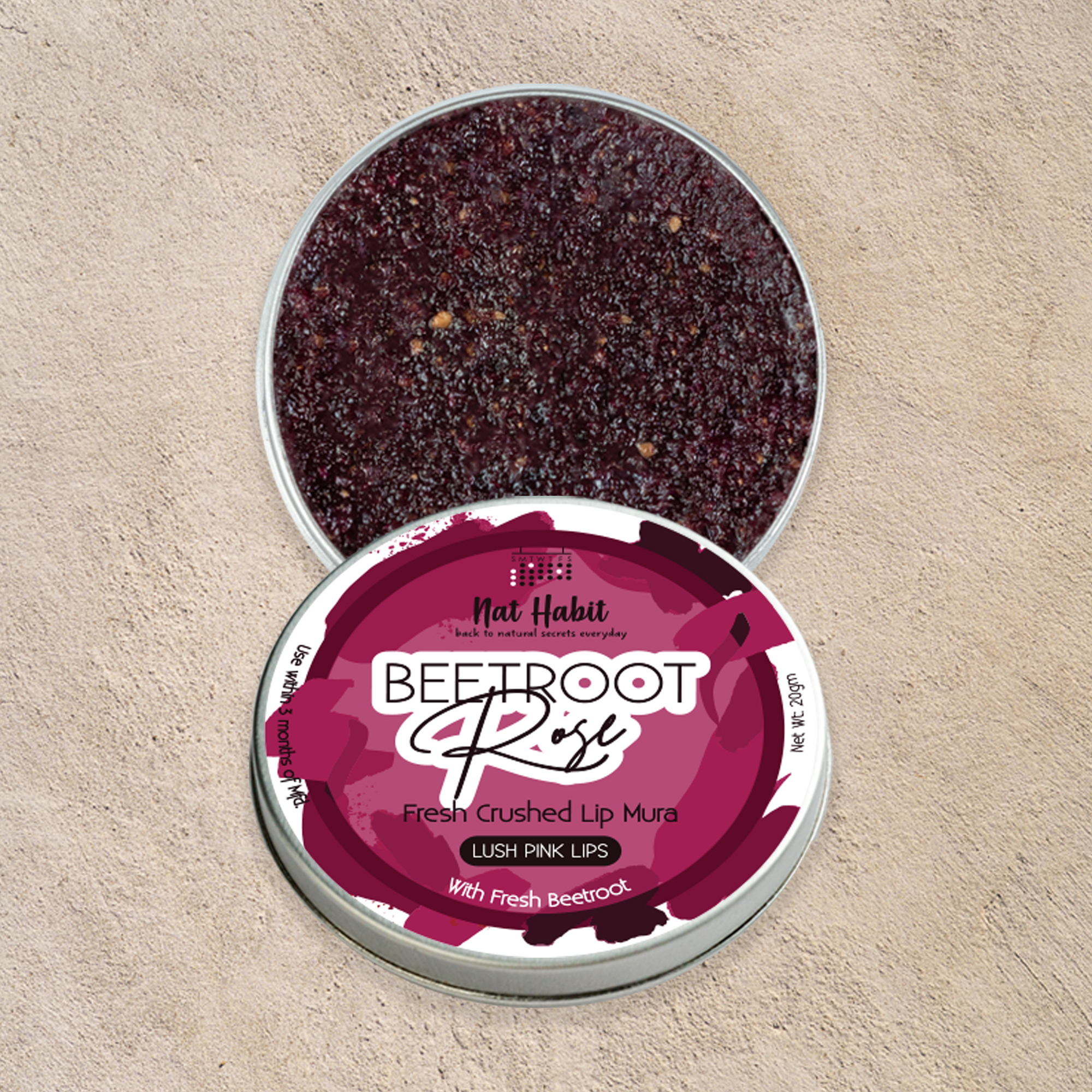 Nat Habit Beetroot Rose Lip Mura is a lip scrub is made of fresh beetroot, rose, desi cow ghee, eucalyptus honey, shea butter and pure cold pressed oils for gradual reddening of lips natural color. It also offers protection from darkening and contains zero chemicals and preservatives with no mineral oil and paraffins.