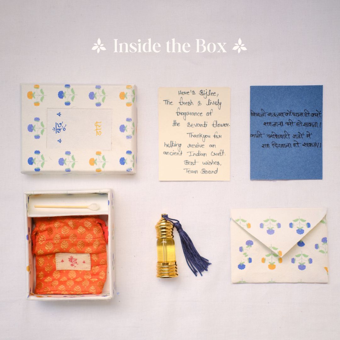 A fresh, energizing fragrance: The Boond Bijlee fragrance is the fresh and lively fragrance of the Sevanti flower.Alcohol-free, natural & pure: The fragrance is completely pure and natural. It does not contain alcohol or any chemicals. It is made from natural materials that are sourced responsibly from across India.