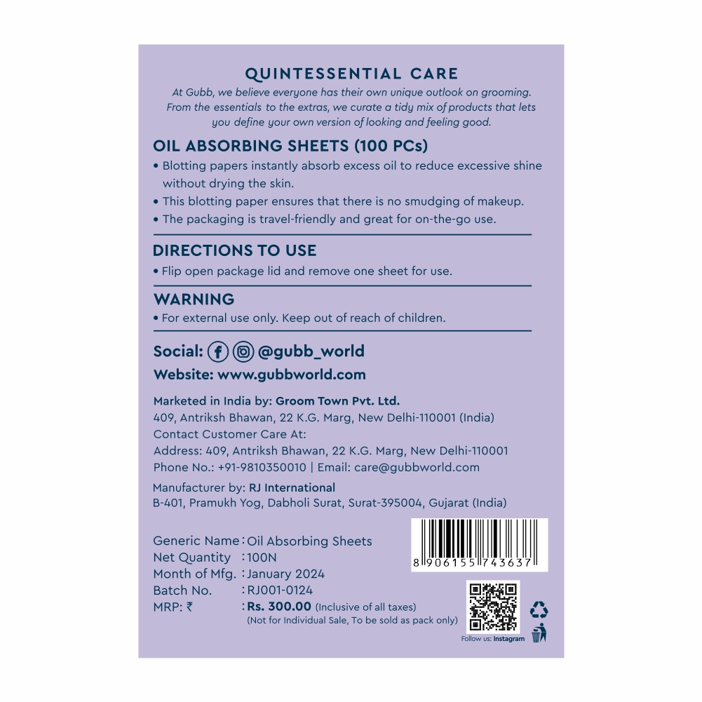 GUBB oil absorbing sheets come in a set of 100 blotting sheets for absorbing excess oil for mess-free touch-ups. With calming green tea extract, refresh your skin on the go.