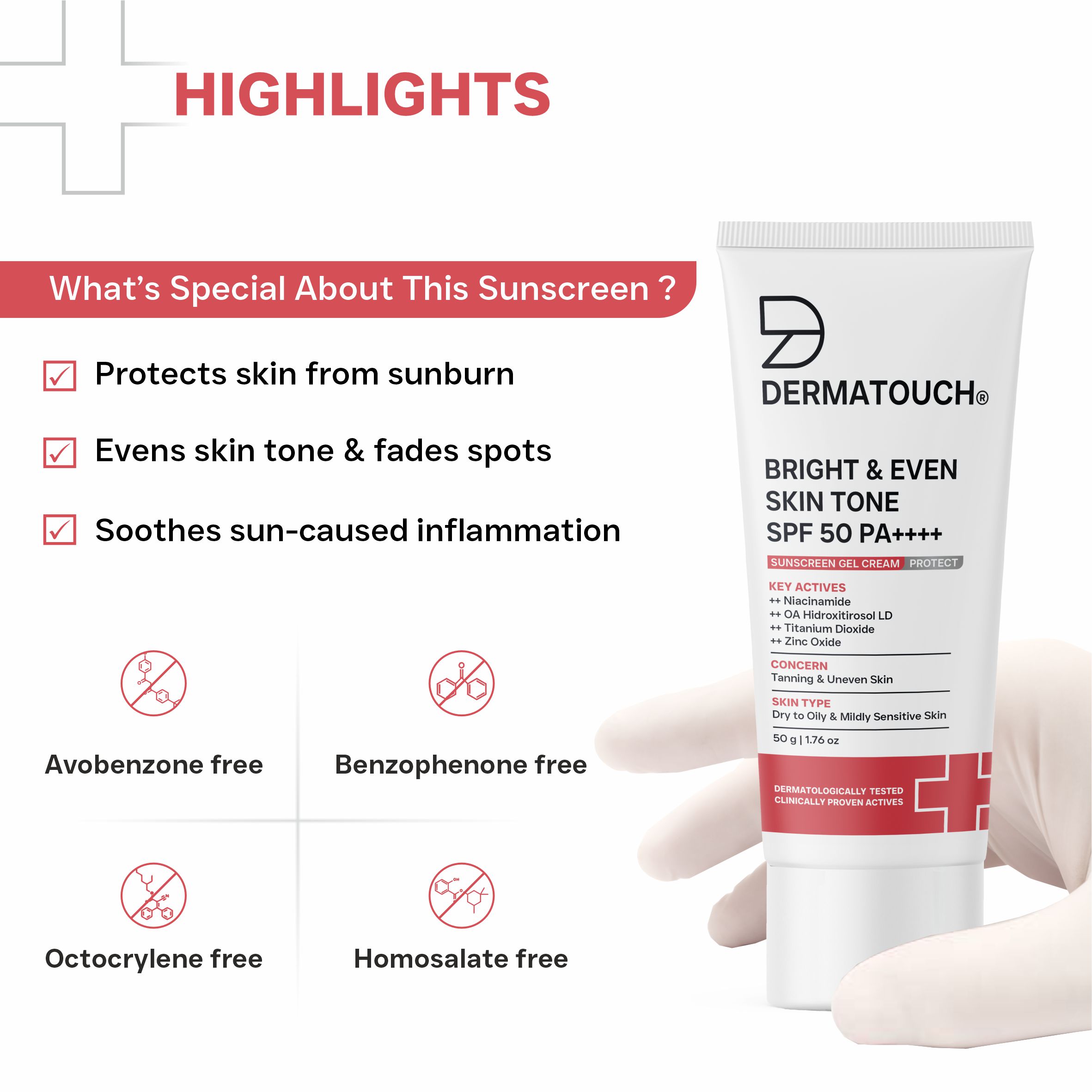 Dermatouch BRIGHT & EVEN SKIN TONE SPF 50 PA++++ SUNSCREEN Gel Cream for Tanning, Uneven Skin Tone & Sun Protection / Suitable for Dry to Oily & Mildly Sensitive Skin | 50gm