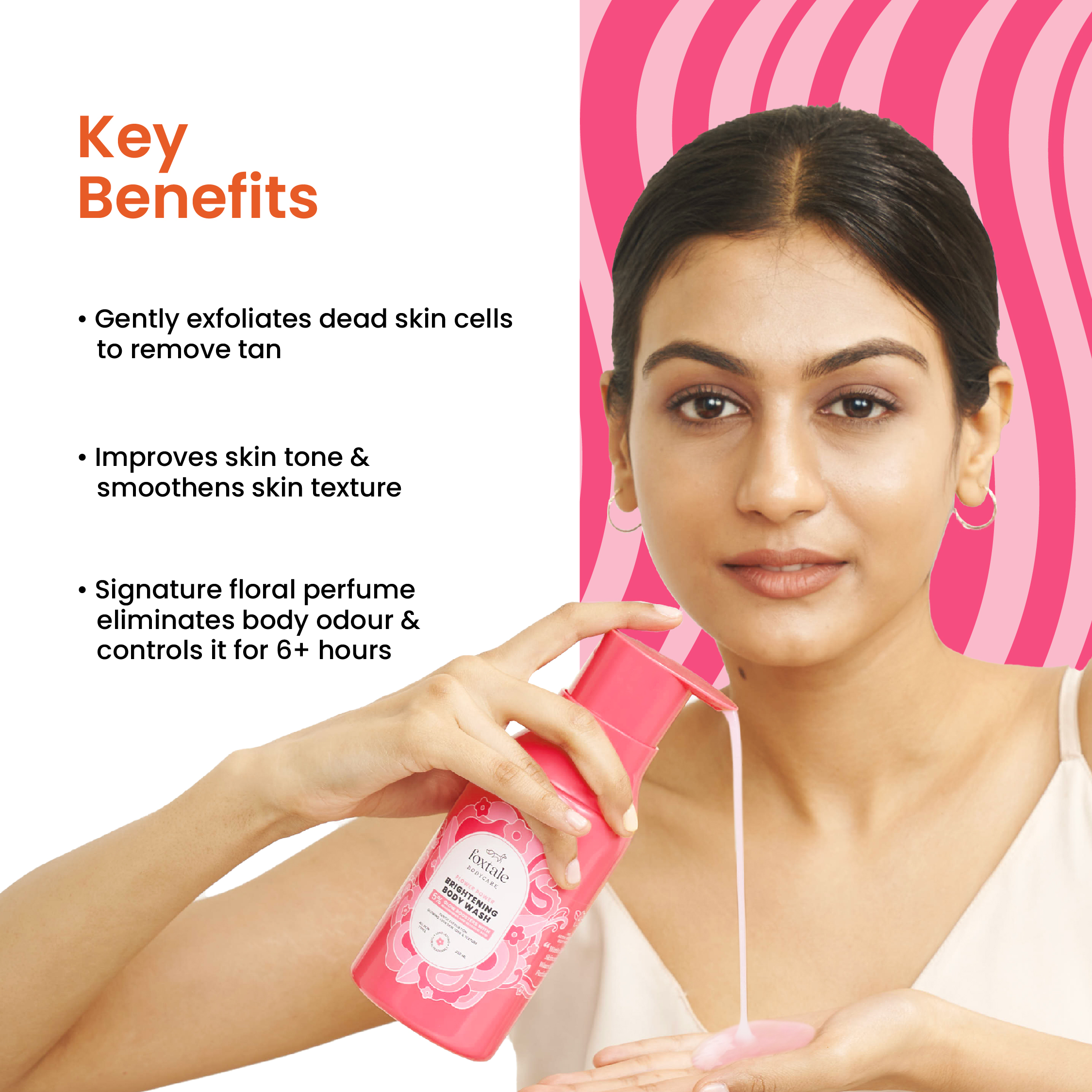 This active-infused body wash exfoliates dead skin cells to brighten & even skin tone over time. Infused with a signature floral perfume, it controls body odour for 6+ hours. It truly works like skincare, wears like perfume.