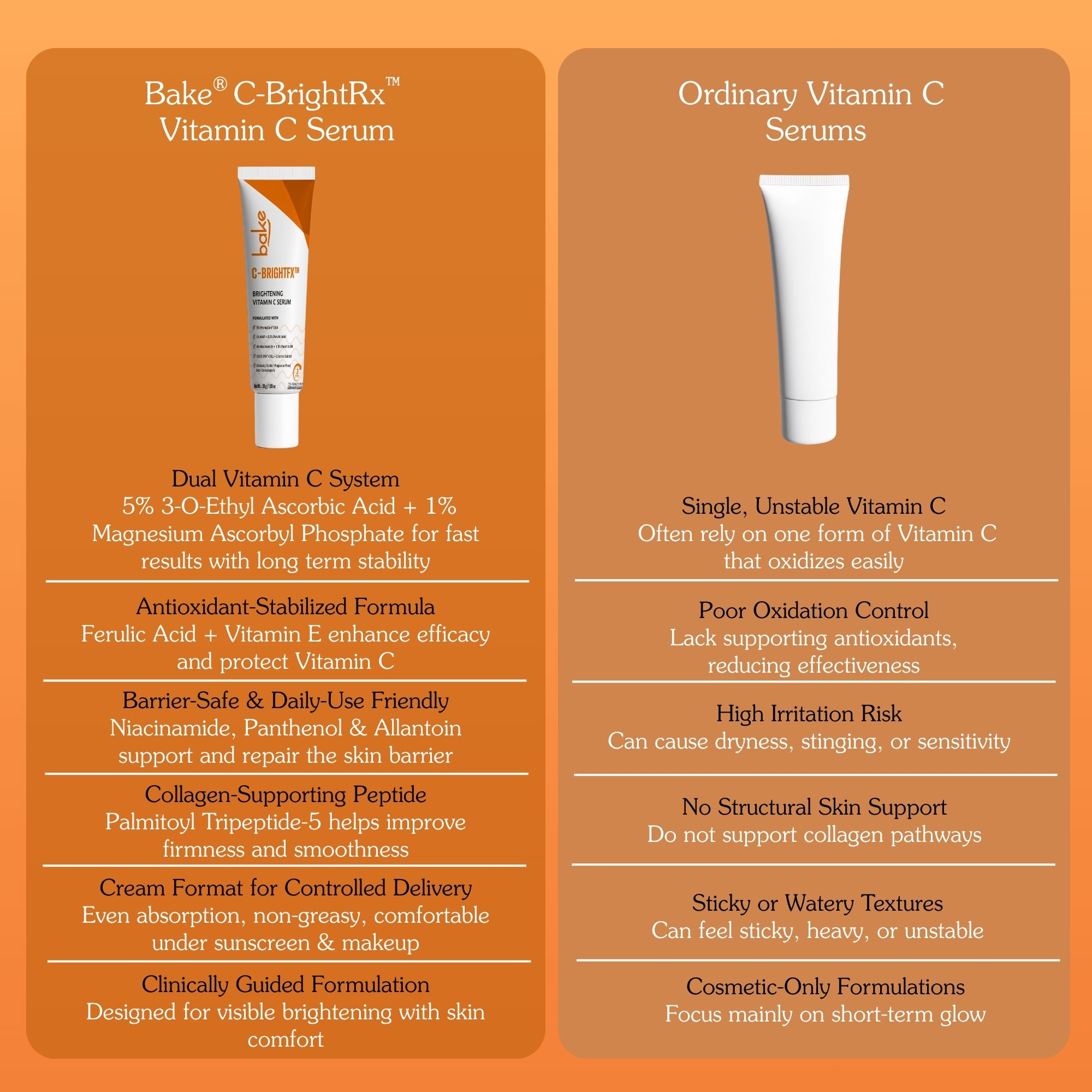 DUAL VITAMIN C SYSTEM - STABLE, POTENT & FAST-ACTING: Formulated with 5% PromaCare EAA (3-O-Ethyl Ascorbic Acid) + 1% MAP (Magnesium Ascorbyl Phosphate) - two complementary, highly stable Vitamin C derivatives that target dark spots, inhibit melanin production, and deliver long-lasting radiance without oxidizing. ANTIOXIDANT-STABILIZED WITH FERULIC ACID + VITAMIN E + ROSEHIP OIL: 0.3% Ferulic Acid and 0.5% Vitamin E amplify Vitamin C's efficacy and protect skin against free radical damage and environmental oxidative stress. 1.5% Rosehip Seed Oil delivers essential fatty acid nourishment, supports skin regeneration, and helps visibly reduce fine lines, scars, and uneven texture for a healthier, more youthful-looking complexion. 4% NIACINAMIDE + PEPTIDE FOR BARRIER STRENGTH & COLLAGEN SUPPORT: 4% Niacinamide works in synergy with Vitamin C to fade post-acne marks, refine texture, minimize pores, and strengthen the moisture barrier. 0.05% SYN-COLL (Palmitoyl Tripeptide-5) supports collagen production for improved firmness and smoothness. Allantoin and dl-Panthenol soothe and hydrate for comfortable daily use - morning and night. NON-COMEDOGENIC | FRAGRANCE-FREE | AM + PM USE: Unlike watery, unstable Vitamin C serums that oxidize quickly and cause stinging, this cream-serum hybrid is pH-balanced, clinically stable, and designed for twice-daily use on face and neck. Non-greasy texture absorbs evenly and sits comfortably under sunscreen and makeup. Suitable for all skin types including sensitive and acne-prone skin. VISIBLE RESULTS IN 6 WEEKS: Every active is disclosed with its exact percentage - 5% PromaCare EAA, 4% Niacinamide, 1.5% Rosehip Oil, 1% MAP, 0.5% SYN-COLL, 0.5% Licorice Extract, and more. Co-formulated with dermatologists. Always follow with SPF in the morning for best results.