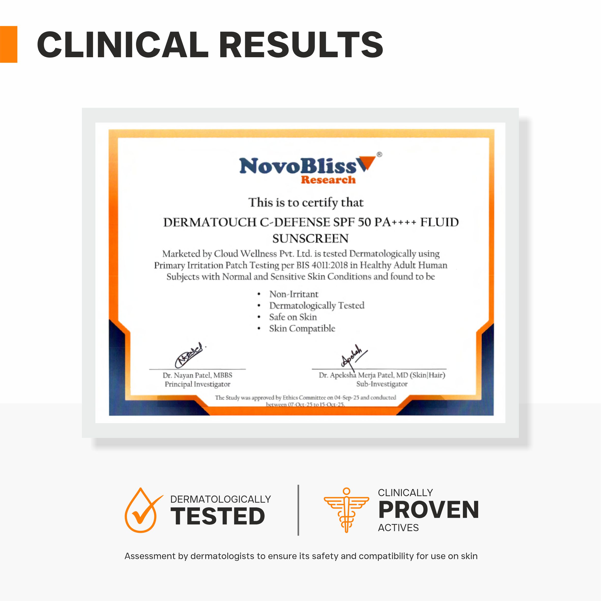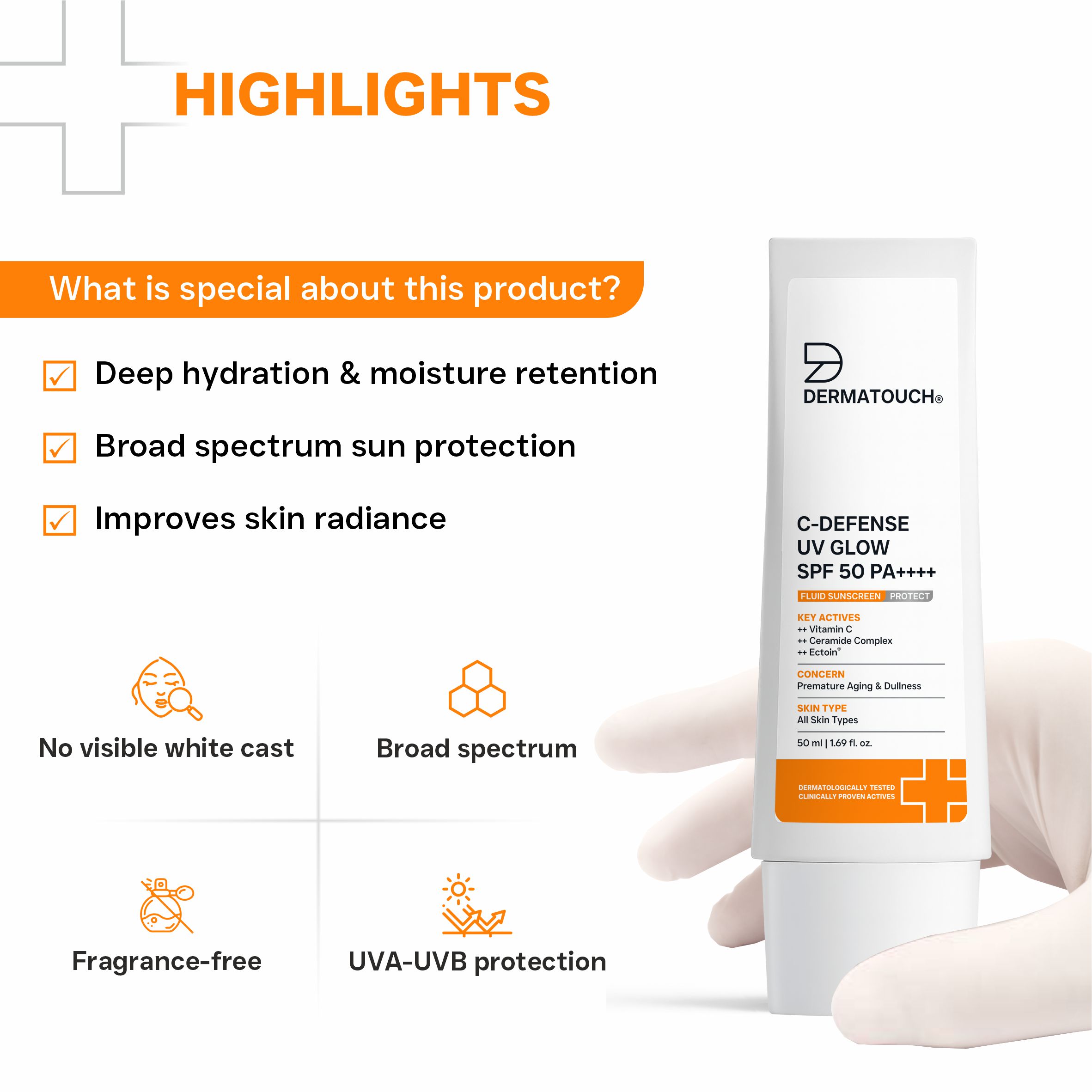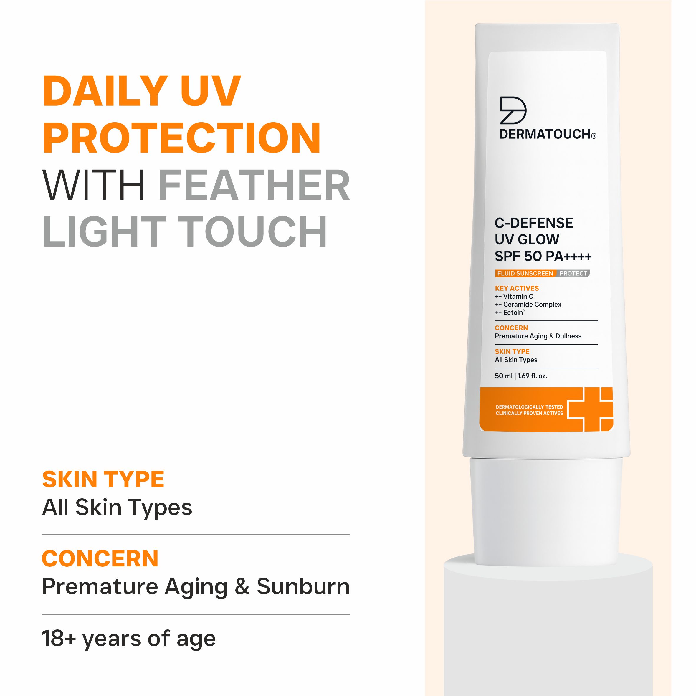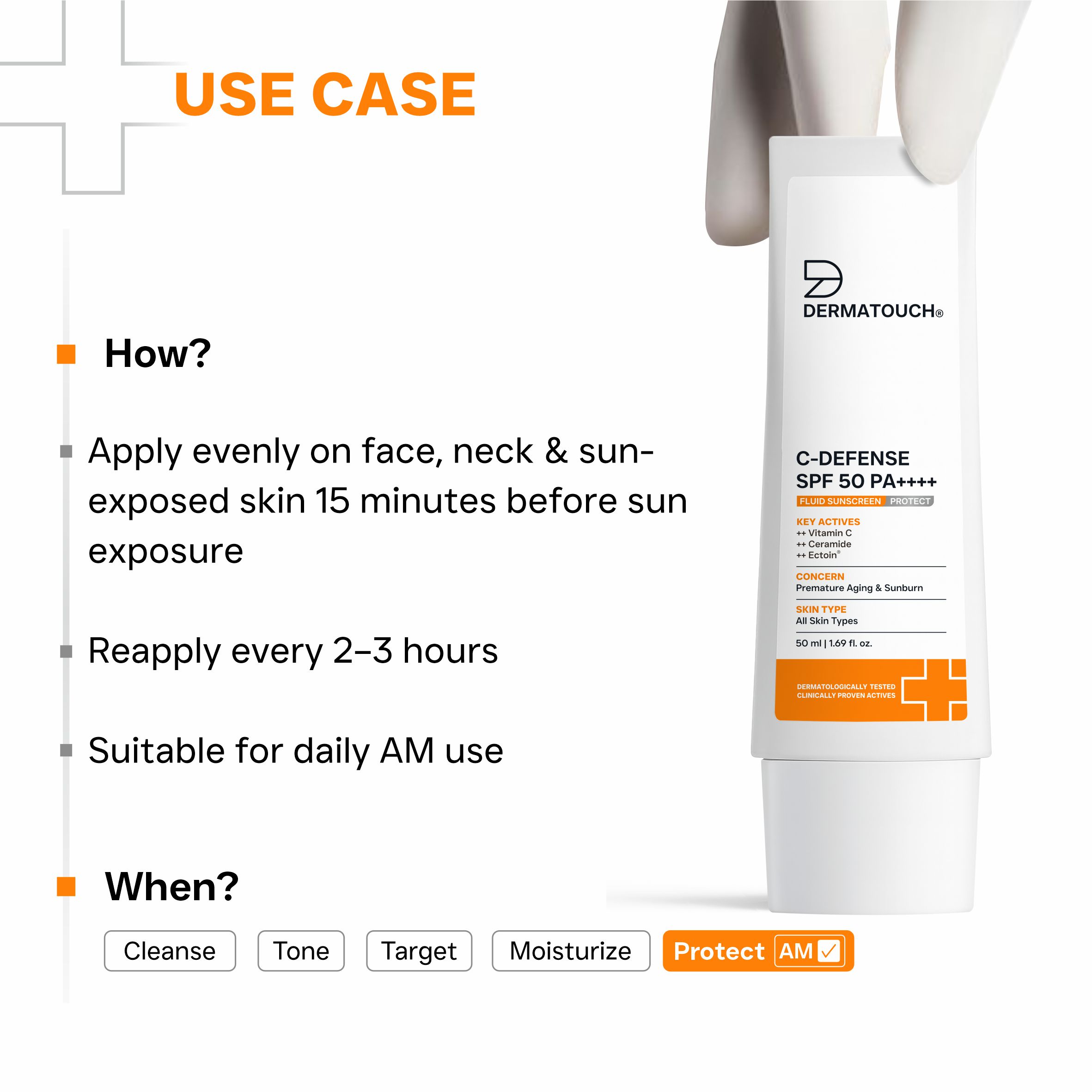 DERMATOUCH C-Defense SPF 50 PA++++ Fluid Sunscreen is a high-performance formula designed to defend your skin from UV rays while delivering antioxidant support and deep hydration. With Vitamin C to enhance radiance, Ceramides to reinforce the skin barrier, and Ectoin to protect against environmental stress, it keeps the skin healthy, hydrated, and visibly bright.