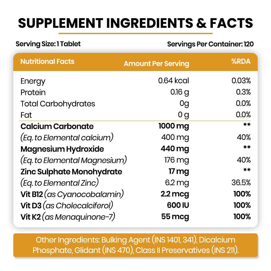 Bothered by weak bones? Want to run freely without any pain in bones or joints? Well, you can still do it! Presenting Himalayan Organics Calcium Magnesium Zinc D3 B12 K2 tablets having the most absorbable form of 6 nutrients resulting in 6X better health. Together these fasten the process of calcium absorption & manage bone mineralization that helps in increasing bone density. A mindful combination of the mineral trio with vitamin trio that helps to strengthen bones, enhance mood, boost immunity, regulate heart health and enhance daily cognition. These tablets fulfil your daily requirement of essential vitamins and minerals critical for smooth functioning & avoiding deficiencies. Enjoy superior health by boosting energy and vitality!
