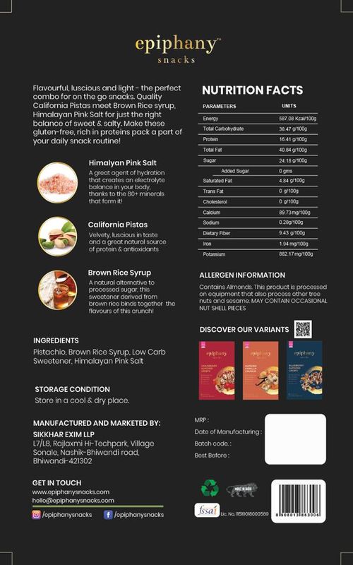 The crispy taste of the Pistachio gets taken over by the mildness of sweet brown rice syrup. An ideal snack on-the-go that fuels 17% protein with its every pack; the California Pistachio Crunch is a crunchy delight not to be missed. With its unconventional combination of freshly selected and peeled green pistachio nuts, the California Pistachio Crunch are bite sized gobbles that not only appeal to the eyes but also infuse preservative-free and cholesterol less nutrition, married with a distinct flavor!