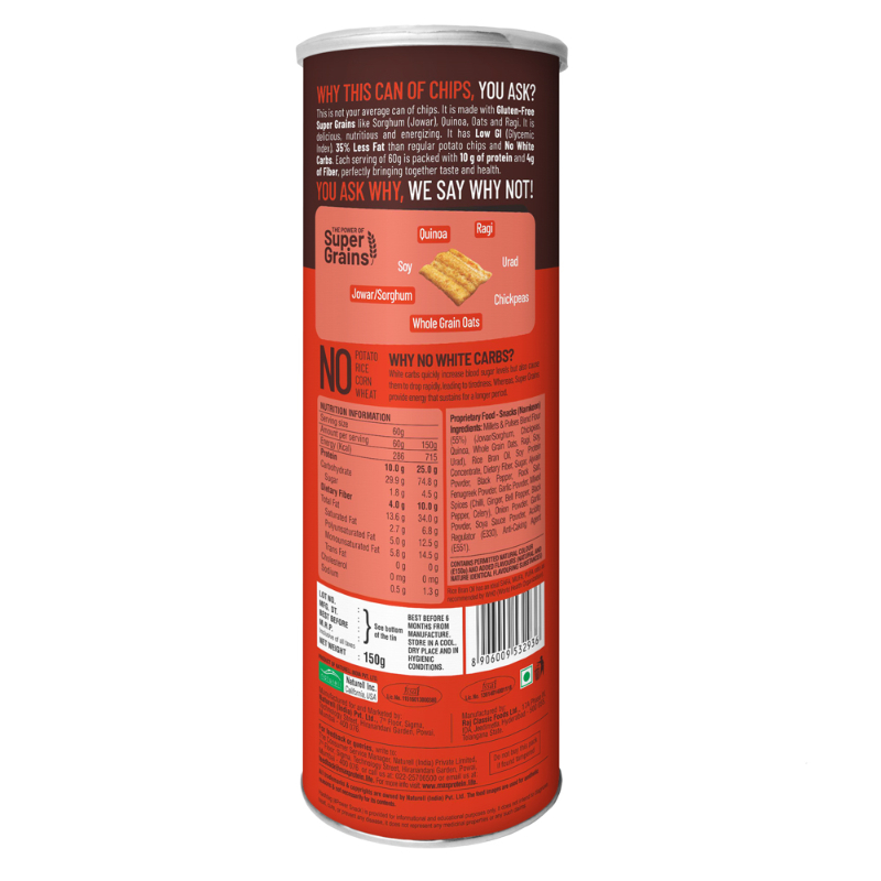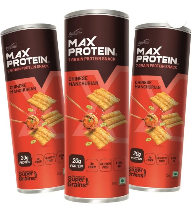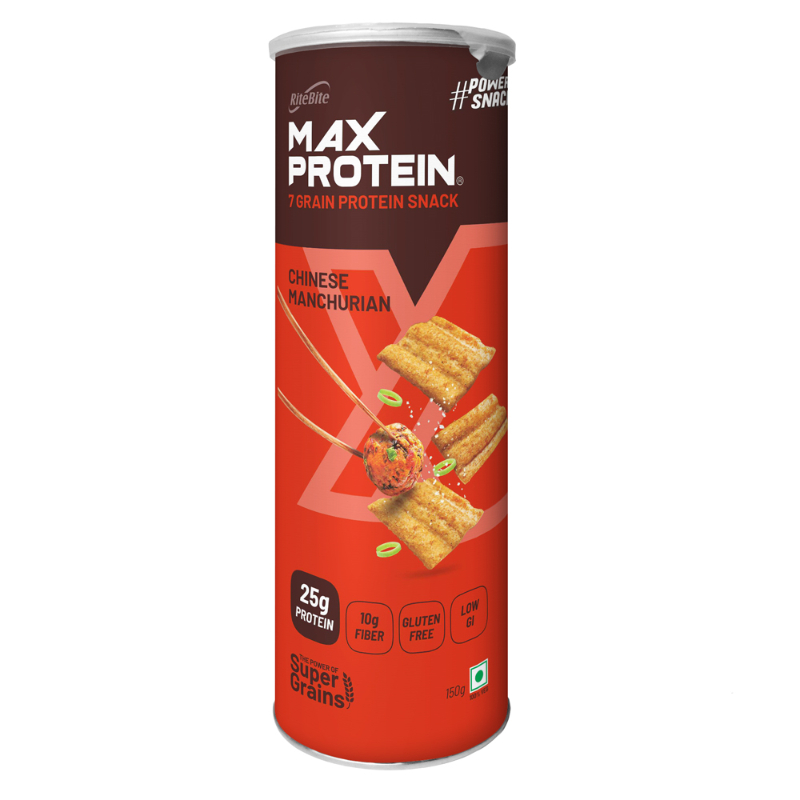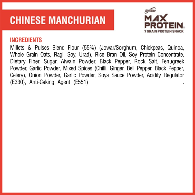 Max protein is made from gluten-free super grains like sorghum (jowar) quinoa, oats, ragi and flavored with delicious Chinese Manchurian masala, these chips are delicious, nutritious and energizing 20g protein - 8g fiber - 28 percent less fat - no white carbs - low gi (glycaemic index). Power pulses like urad, chickpeas and soy add to the protein value.
