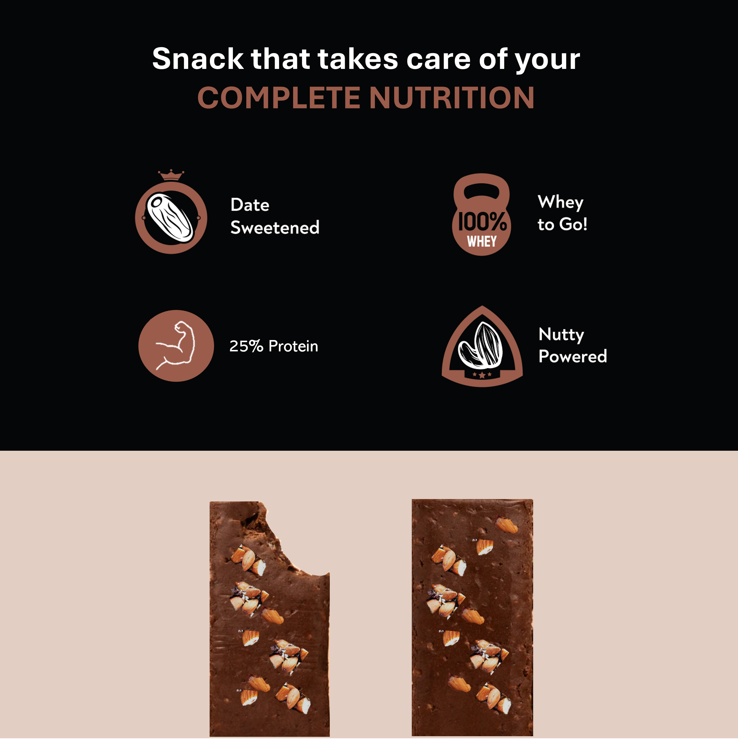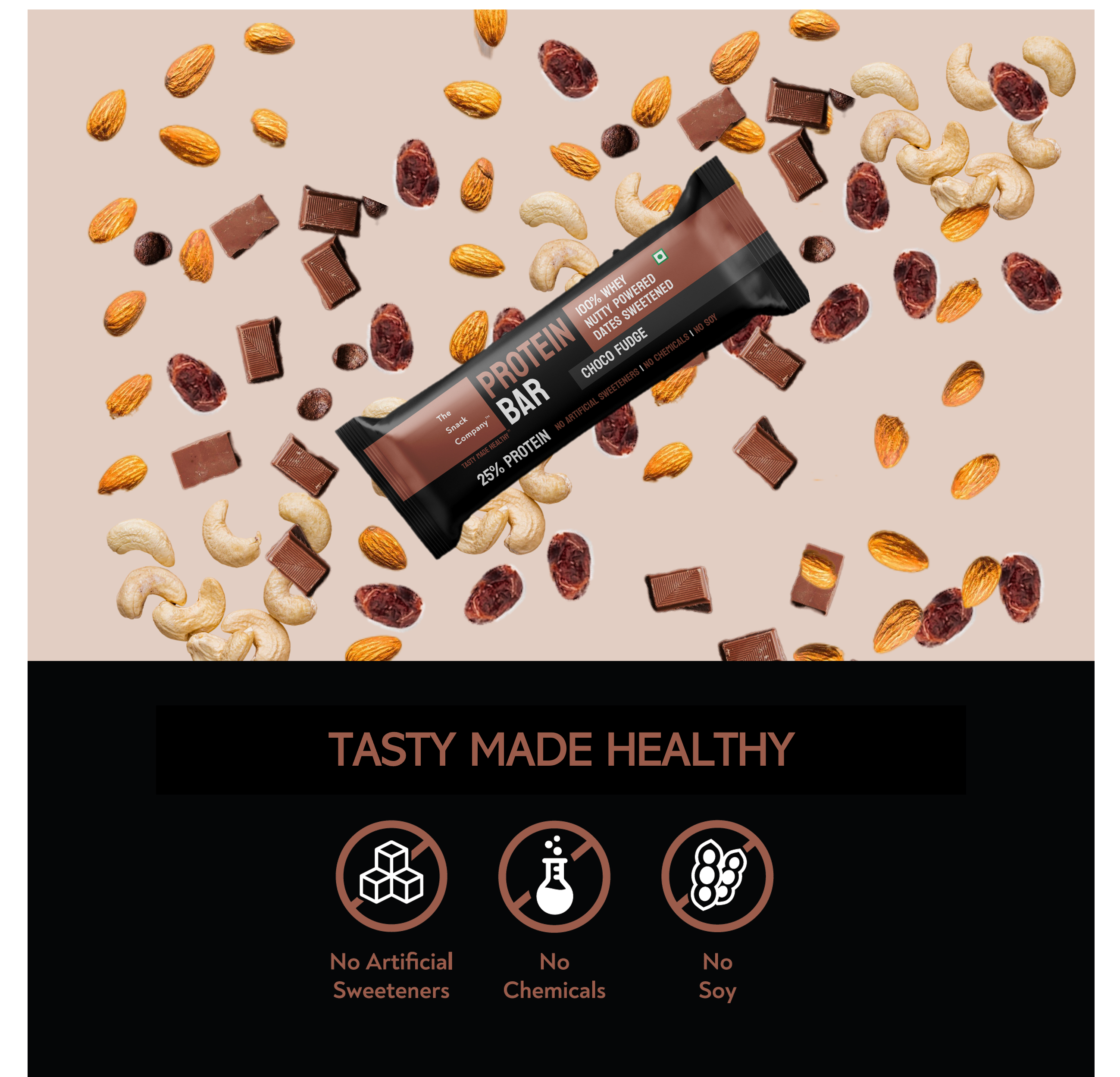 Indulge guilt-free in our Choco Fudge Protein Bar-packed with Whey Protein, dates, premium nuts, and 46.5% Dark Chocolate. The perfect balance of flavor and nutrition to fuel your day!