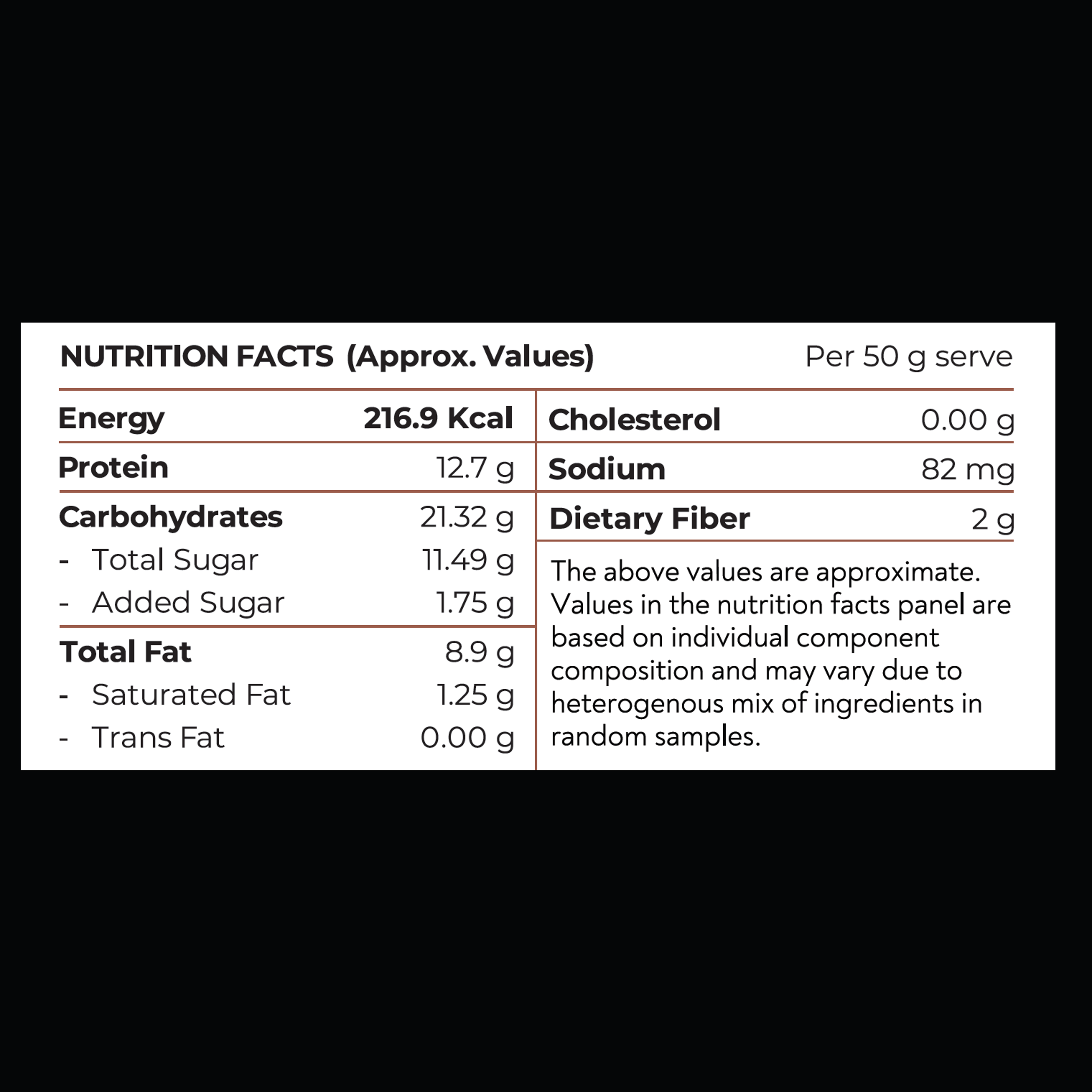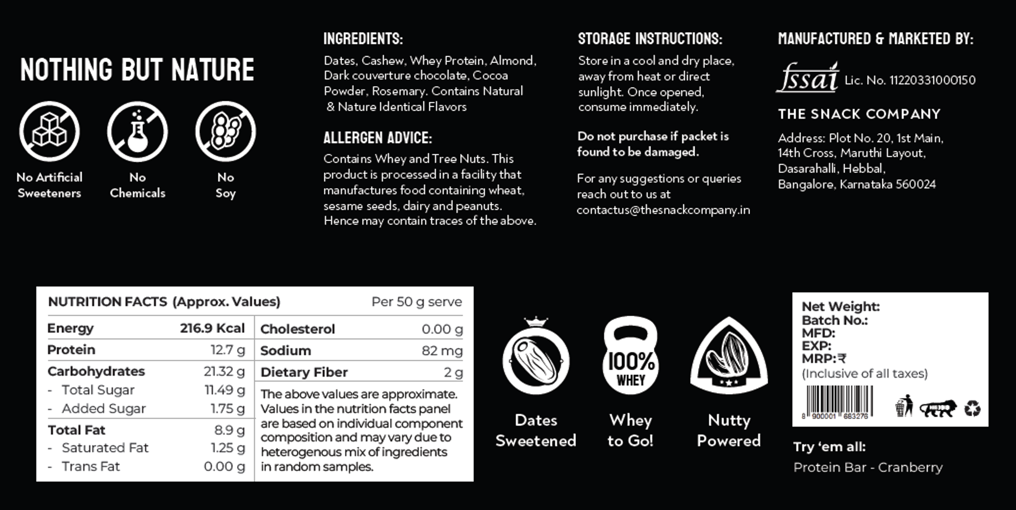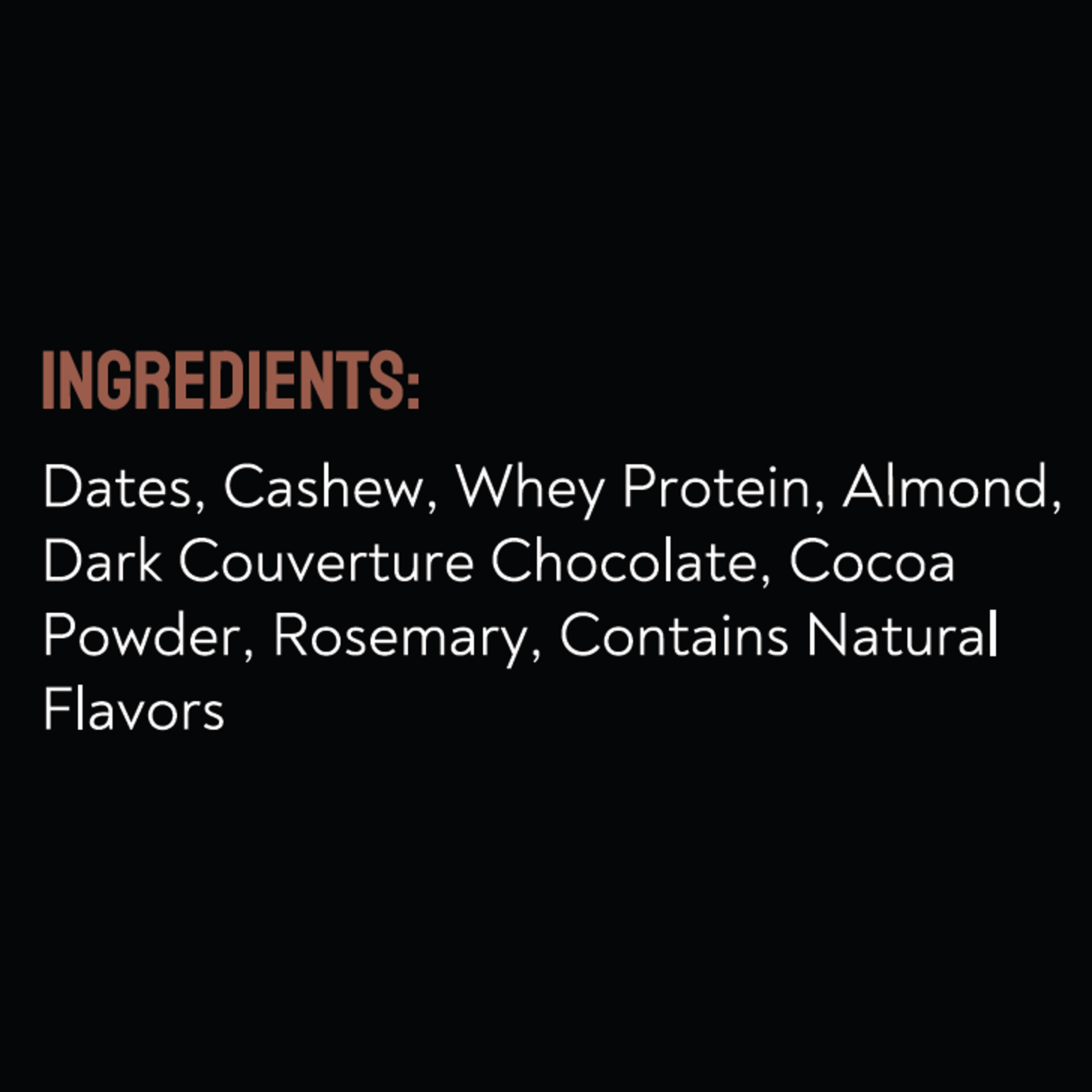Dates, Cashew, Whey Protein, Almond, Couverture Dark Chocolate, Cocoa Powder, Rosemary. Contains Natural Flavors