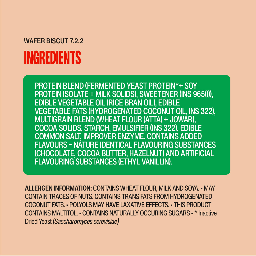 Protein Blend (Fermented Nutritional Yeast Protein + Soya Protein Isolate + Milk Solid),Sweetener (INS 965 (i)),Edible Vegetable Oil (Rice Bran Oil), Edible Vegetable Fats ( Hydrogenated Coconut oils, INS322), Multigrain Blend (Wheat Flour (Atta) + Jowar)