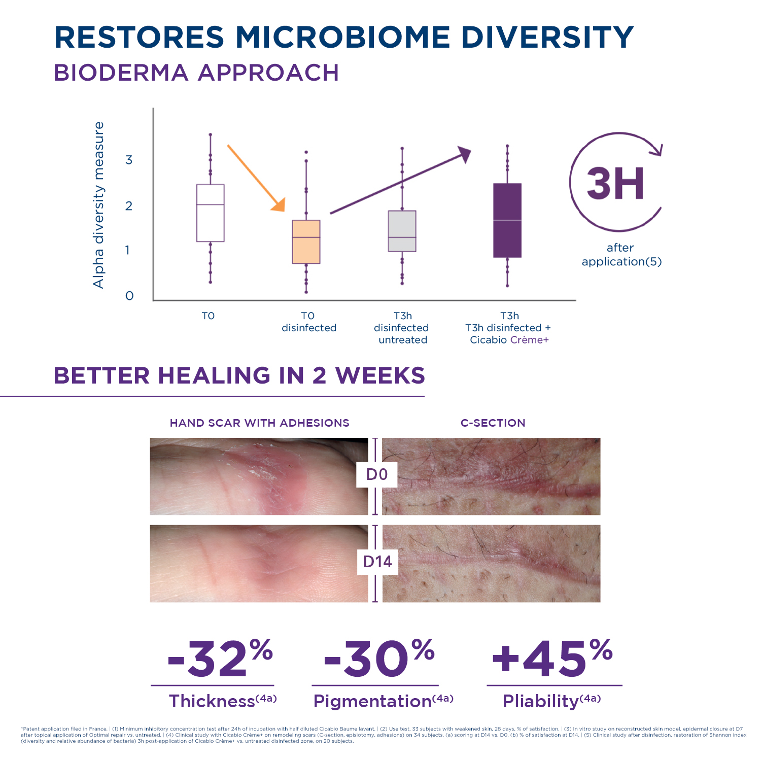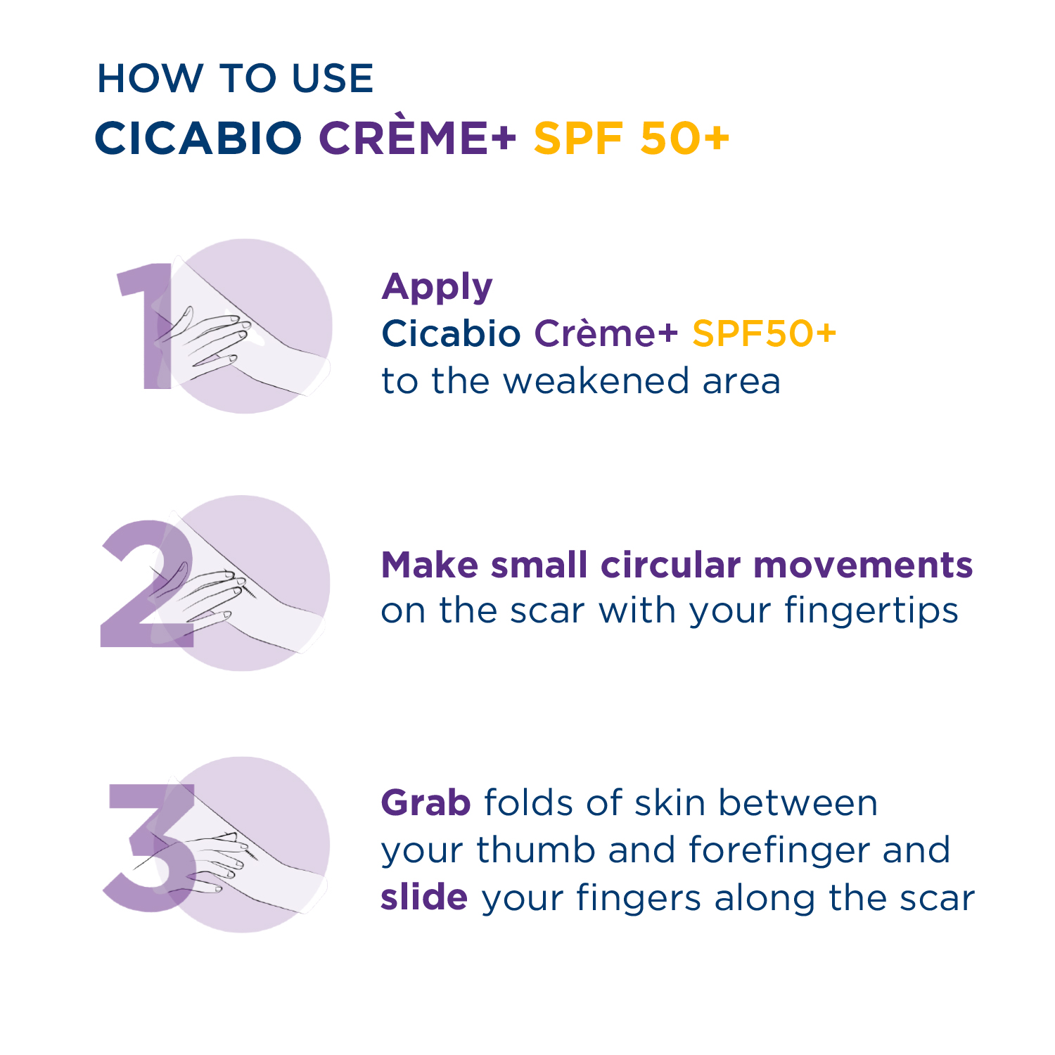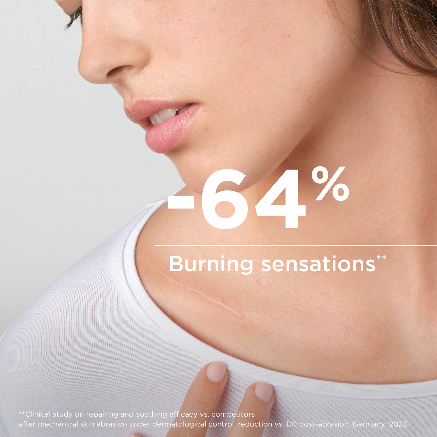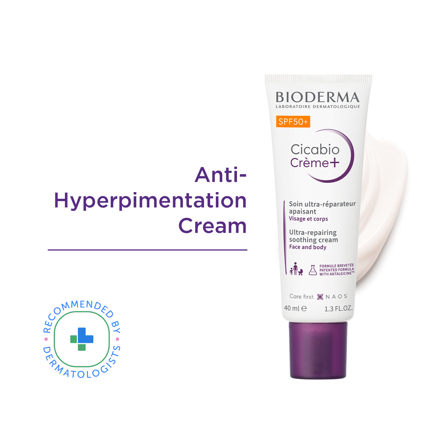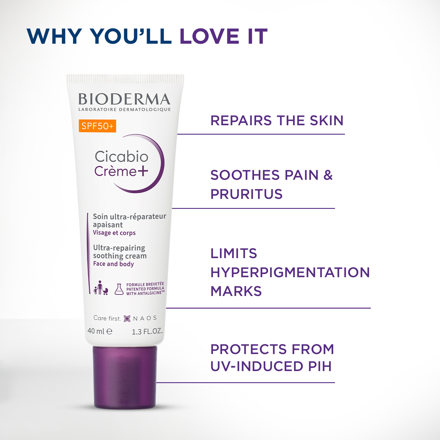 Cicabio SPF 50+ restores weakened skin exposed to the sun by acting at each stage of the biological process of epidermal reconstruction and by limiting the risk of post-scarring hyperpigmentation (brown spots).