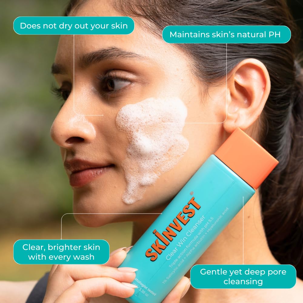 Take control of breakouts with Skinvest Clear Win Face Cleanser, a dermatologist-formulated face wash designed for acne-prone and oily skin. Powered by Salicylic Acid and soothing Aloe Vera, this gentle yet effective cleanser deeply cleanses pores, removes excess oil, and helps reduce pimples without stripping the skin of its natural moisture.