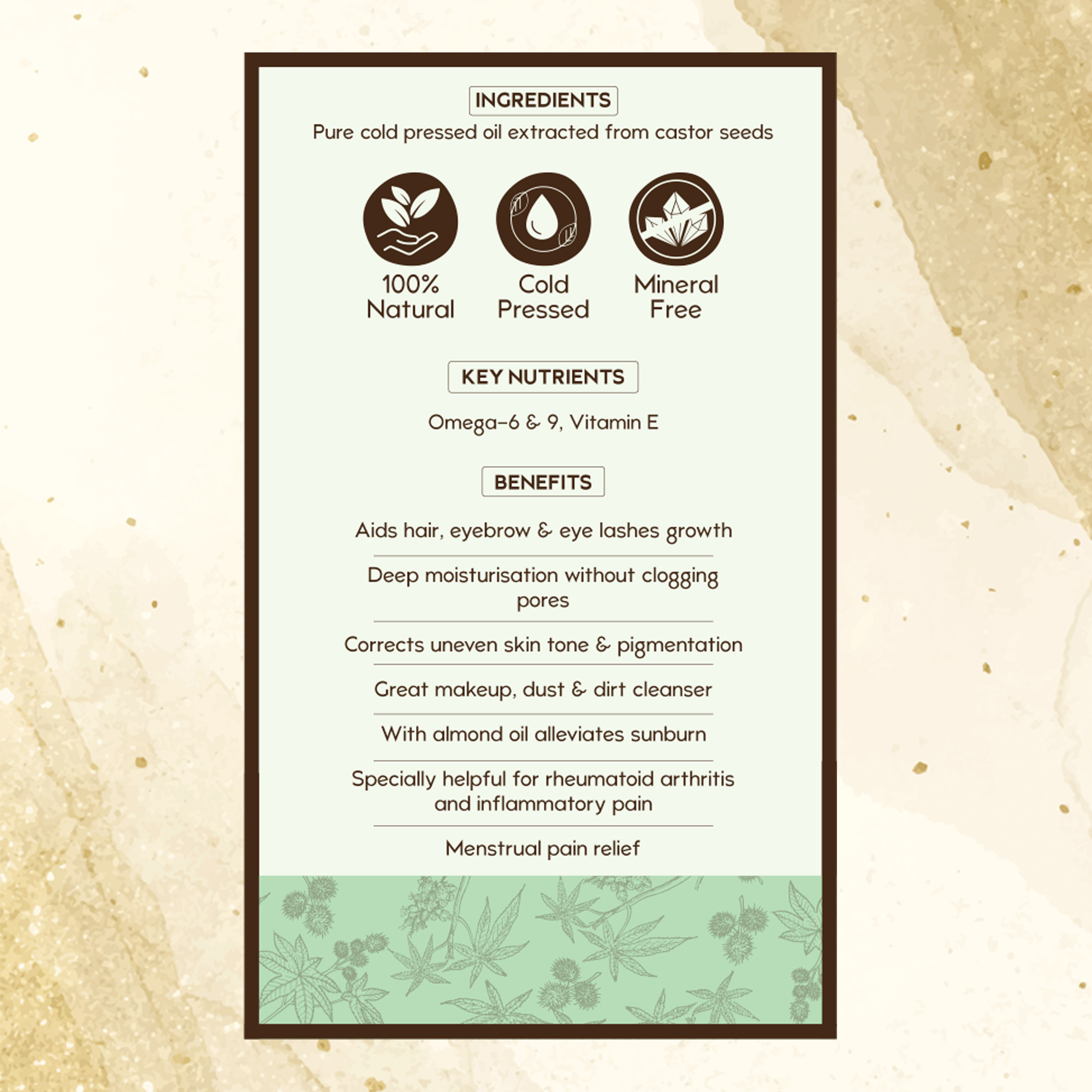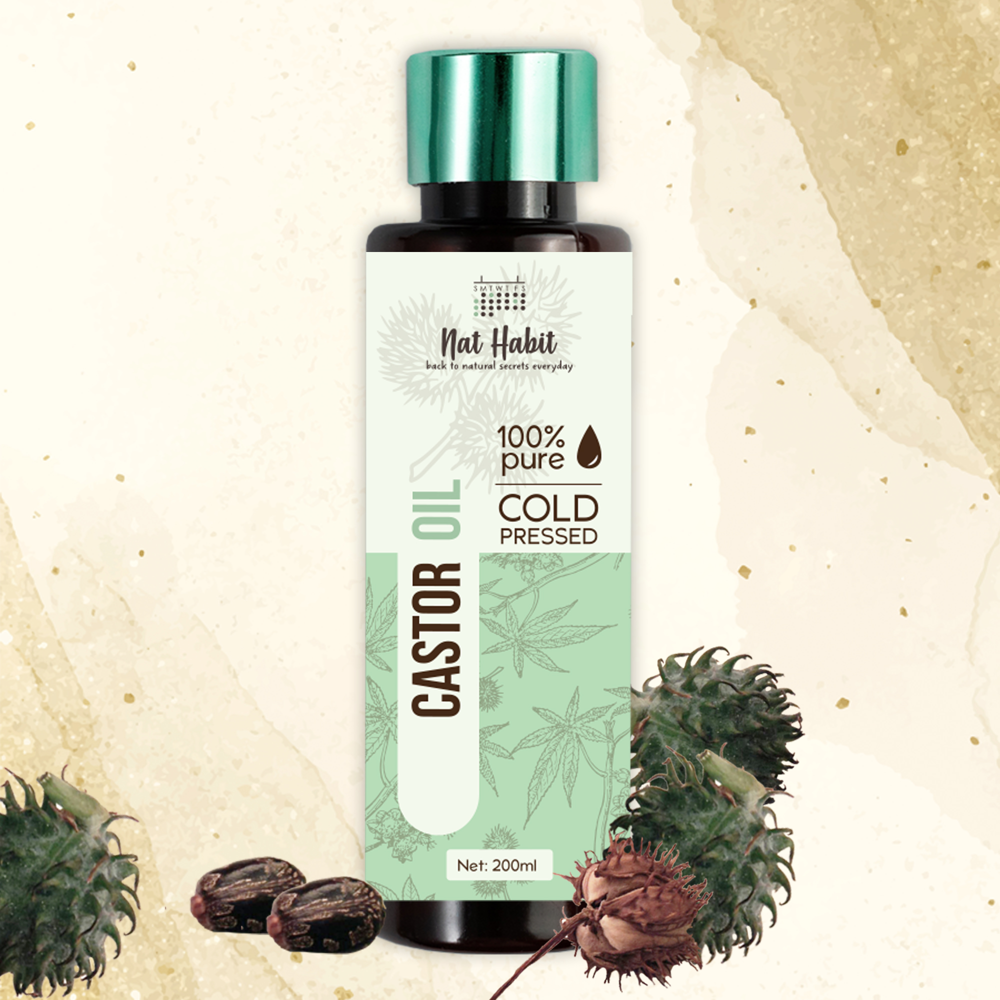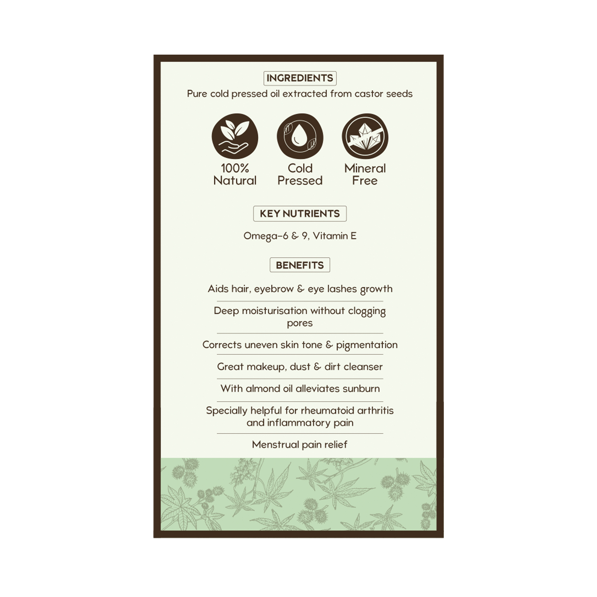 Nat Habit Cold Pressed 100% Pure Castor (Arandi) Oil is extracted from the seeds of the castor fruit. It aids in hair, eyebrow and eyelash growth. Castor oil offers deep moisturisation without clogging pores and corrects uneven skin tone and pigmentation. It is a great makeup remover and can be used with almond oil to provide sunburn relief.
