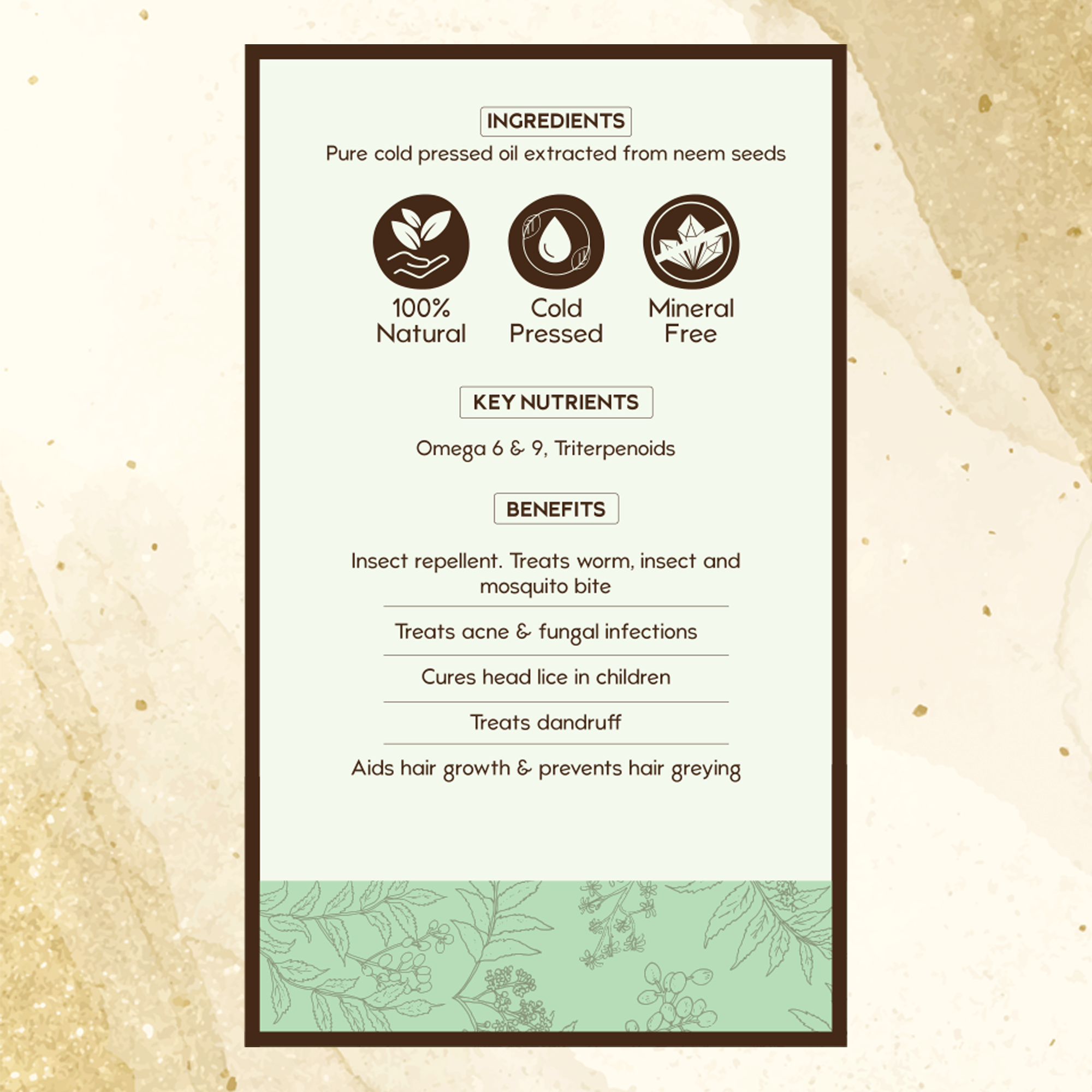 Nat Habit Cold Pressed 100% Pure Neem Oil is extracted from the seeds of neem fruit. It makes an excellent insect repellent and treats worm, insect and mosquito bites. Neem oil treats acne and fungal infections and also combats head lice in children. It treats dandruff and promotes hair growth while preventing hair greying.