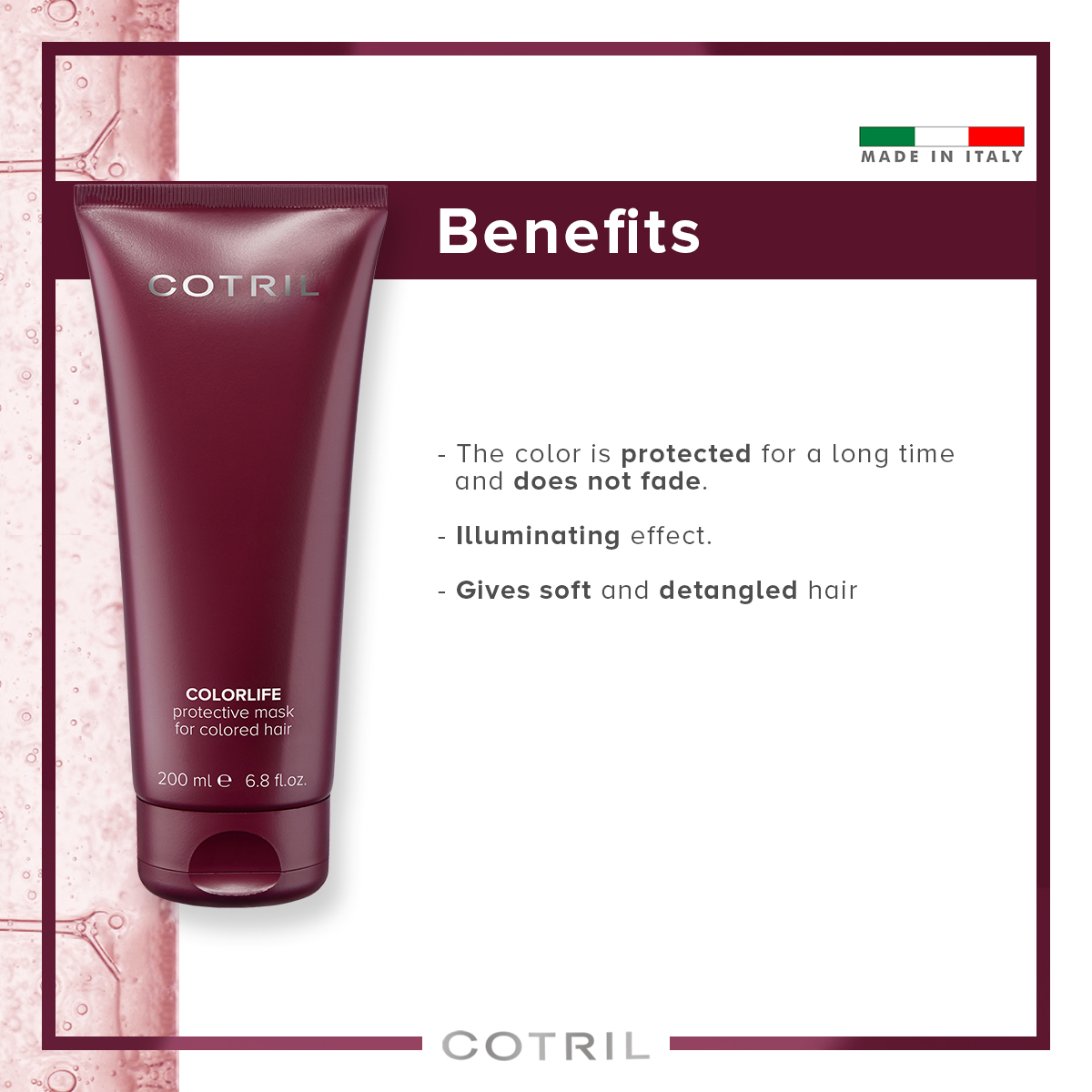 In 2021 Cotril celebrated 50 years of history It is a company that represents 100% Made in Italy excellence and is deeply connected to Milan – the global city of glamour fashion and luxury Cotril’s unique and exclusive luxury positioning has made it a worldwide leader among professional hair care