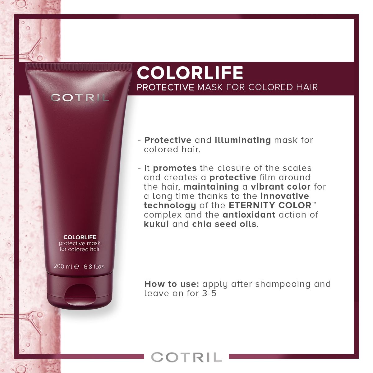 It promotes the closure of the scales and creates a protective film around the hair,maintaining a vibrant color for a long time thanks to the innovative technology of theETERNITY COLORTM complex studied and carefully developed in collaboration with theBiohense laboratories, with antioxidant action.