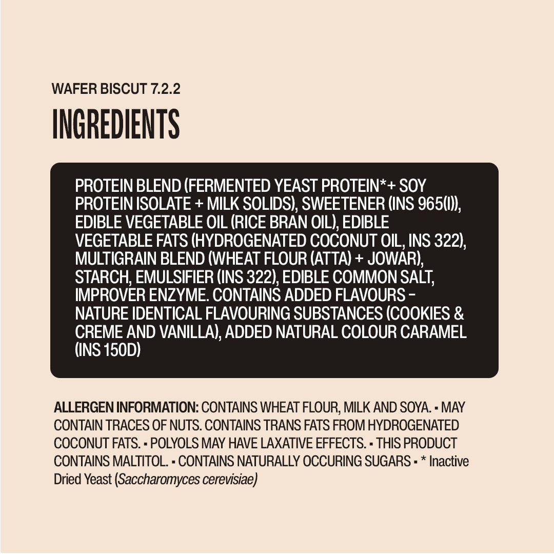 Protein Blend (Fermented Nutritional Yeast Protein + Soya Protein Isolate + Milk Solid),Sweetener (INS 965 (i)),Edible Vegetable Oil (Rice Bran Oil), Edible Vegetable Fats ( Hydrogenated Coconut oils, INS322), Multigrain Blend (Wheat Flour (Atta) + Jowar)