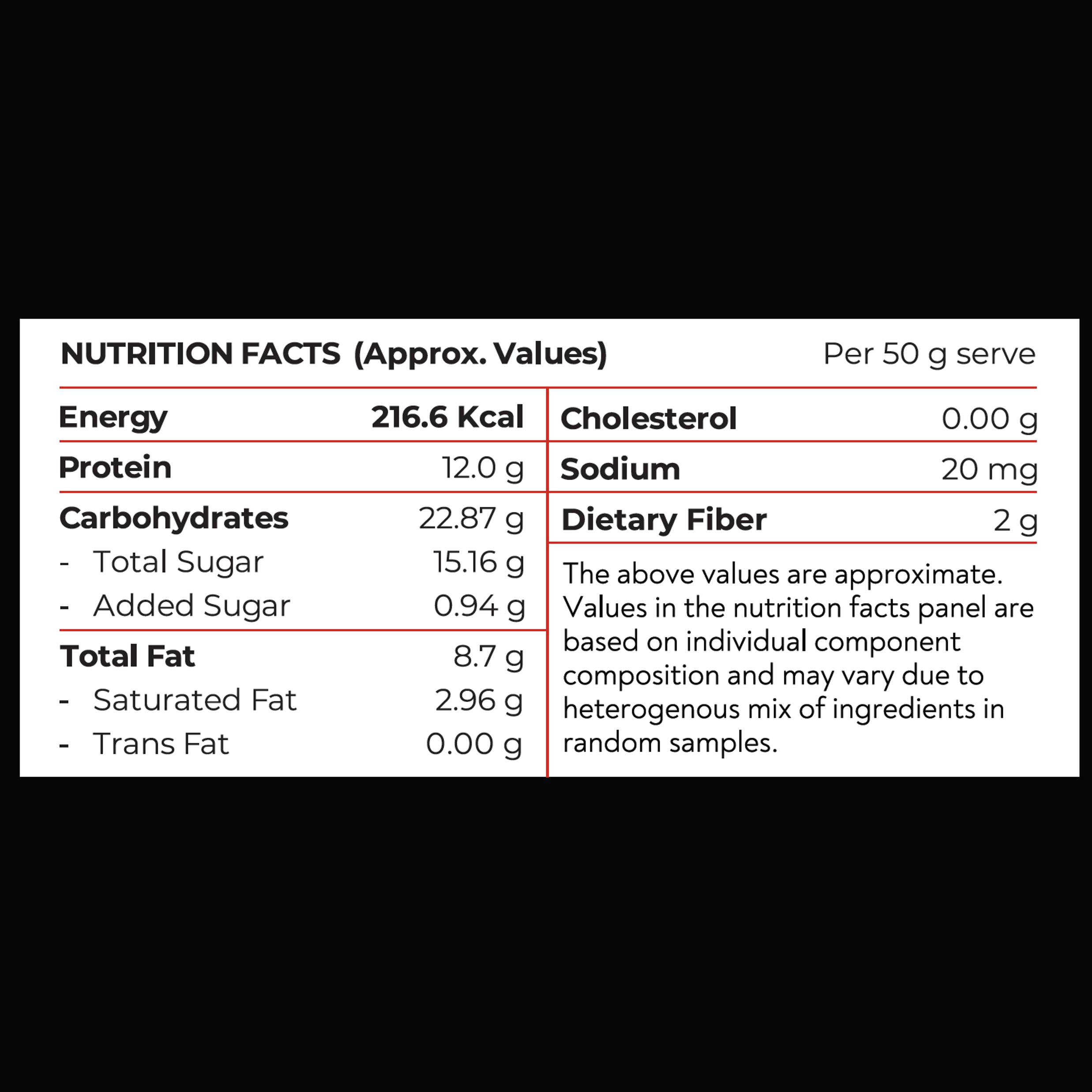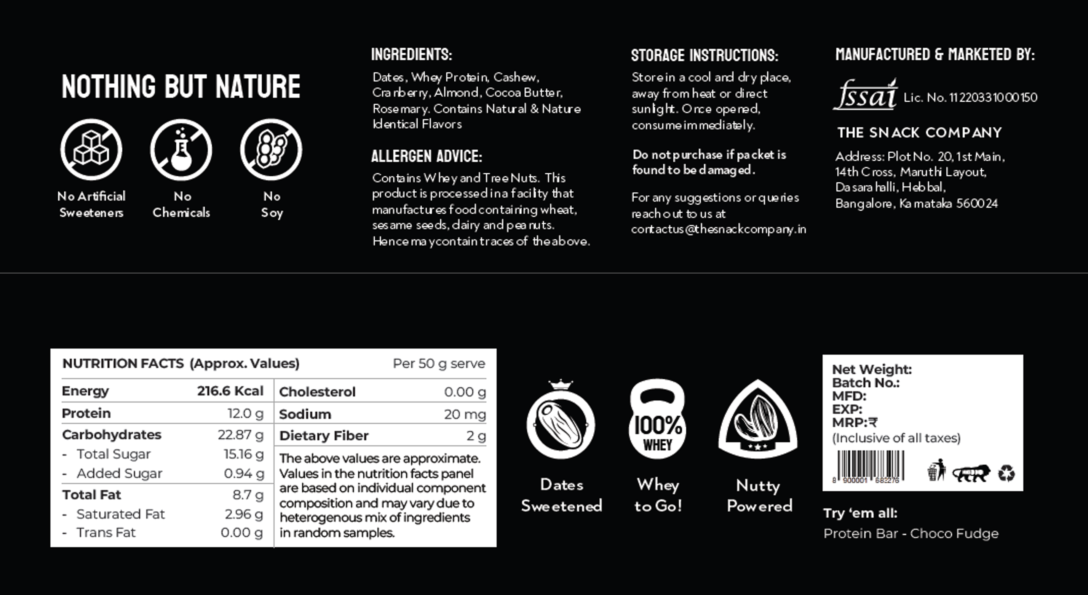 Dates, Whey Protein, Cashew, Cranberry, Almond, Cocoa Butter, Rosemary. Contains Natural Flavors