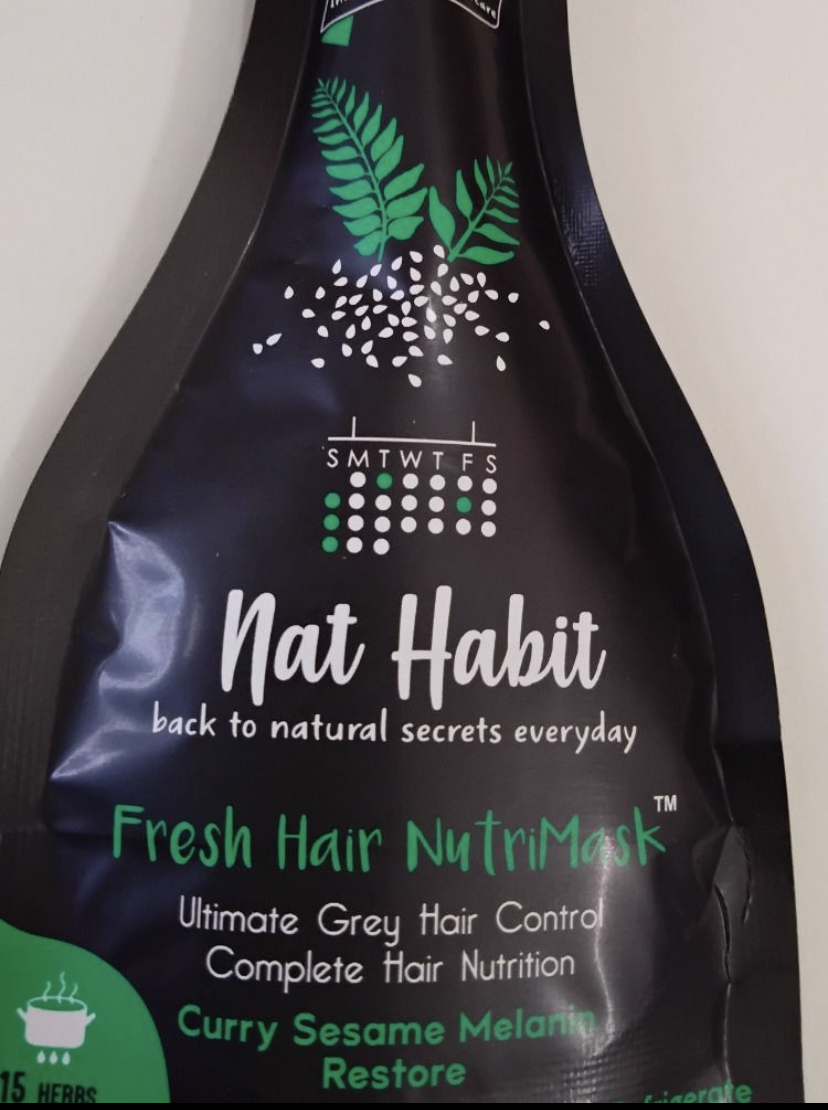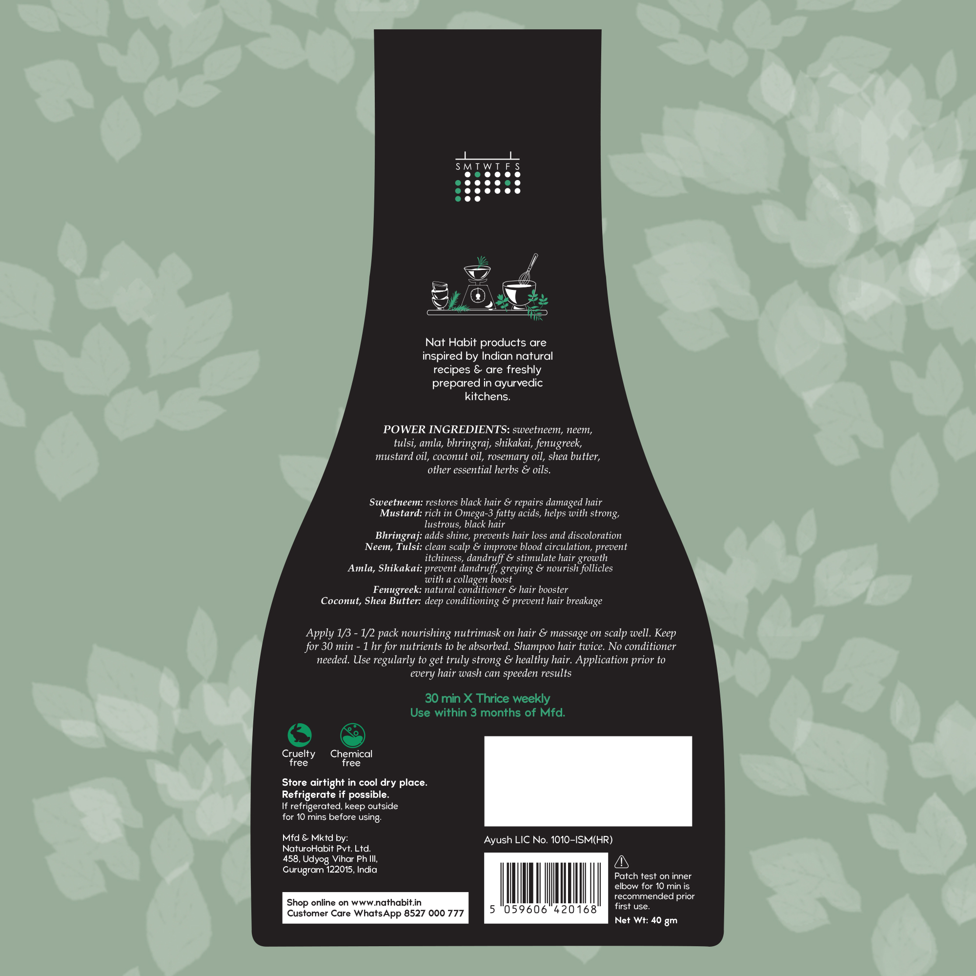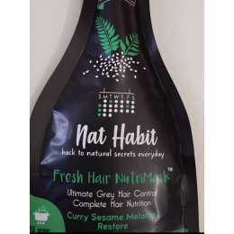 Nat Habit Curry Mustard Fresh Hair Mask (NutriMask) is a kitchen made hair mask for ultimate grey hair control amd complete hair nutrition. Crafted with a slow heat infusion of fresh tulsi leaves, neem, curry leaves, amla, shikakai, bhringraj, fenugreek, mustard and more in a variety of oils. This hair mask contains 15 powerful ingredients packed into one.