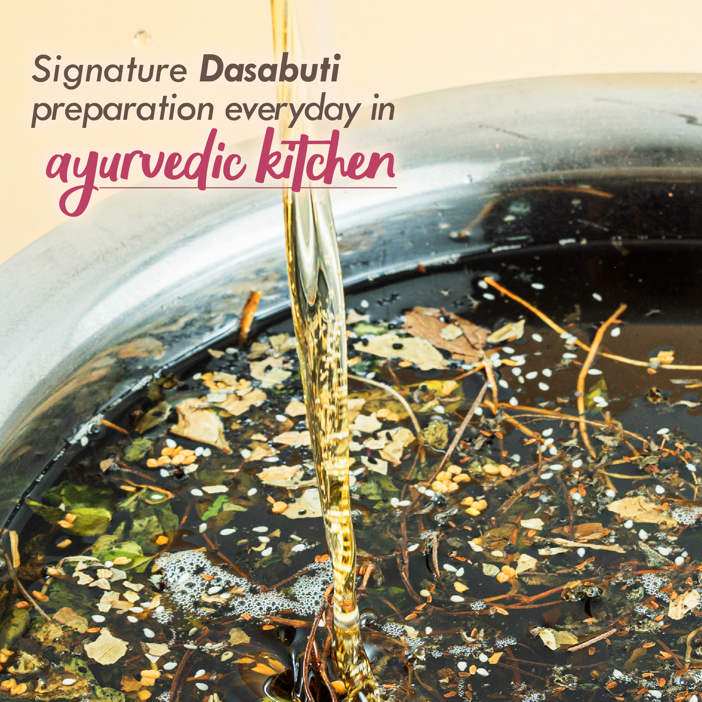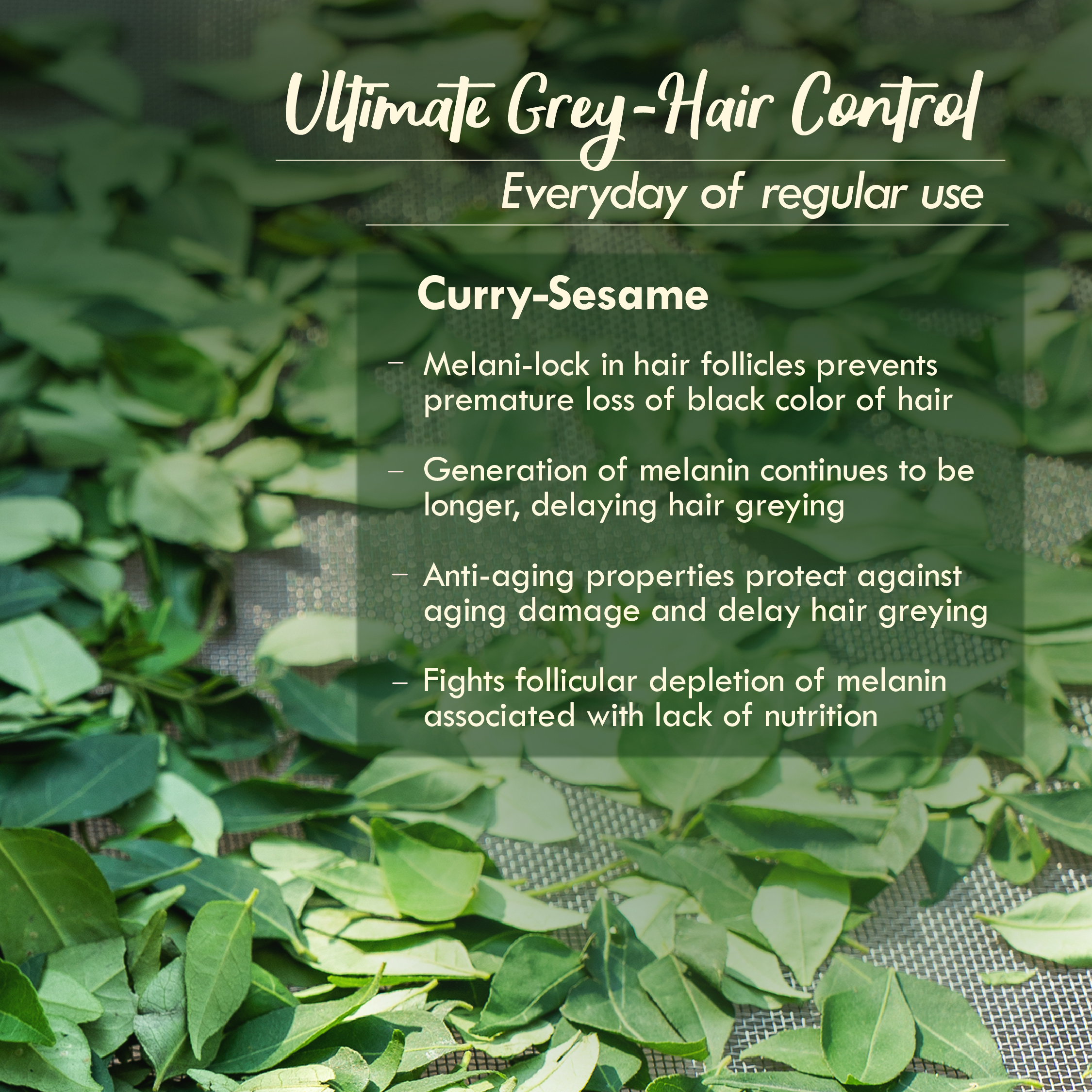 Nat Habit Curry Sesame Anti Greying Summer Dasa Buti Hair Oil is a kitchen fresh hair oil for premature greying prevention, it is specially made with cooling ingredients for summer conditions. This Dasabuti oil is created (for over 10 hours) via a slow heat infusion of fresh curry leaves, black sesame, amla, henna leaves, indigo leaves, shikakai, bhringraj, ratanjot, jaborandi, vetiver, kalonji and more in multiple oils like black sesame, castor and coconut.