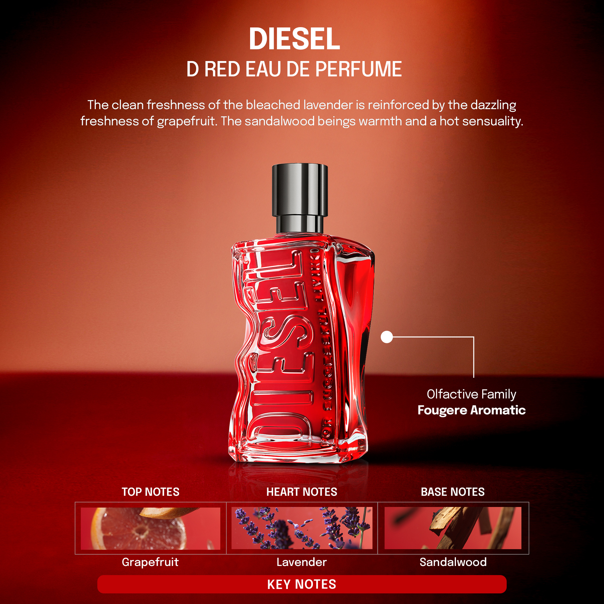 D RED, the new Diesel fragrance for men. D RED expresses the contrast of the clean freshness of lavender enhanced by sparkling grapefruit, to the warm and sensual notes of sandalwood. Dashing but fresh, D-Red is the new masculine fragrance that dares to be different.