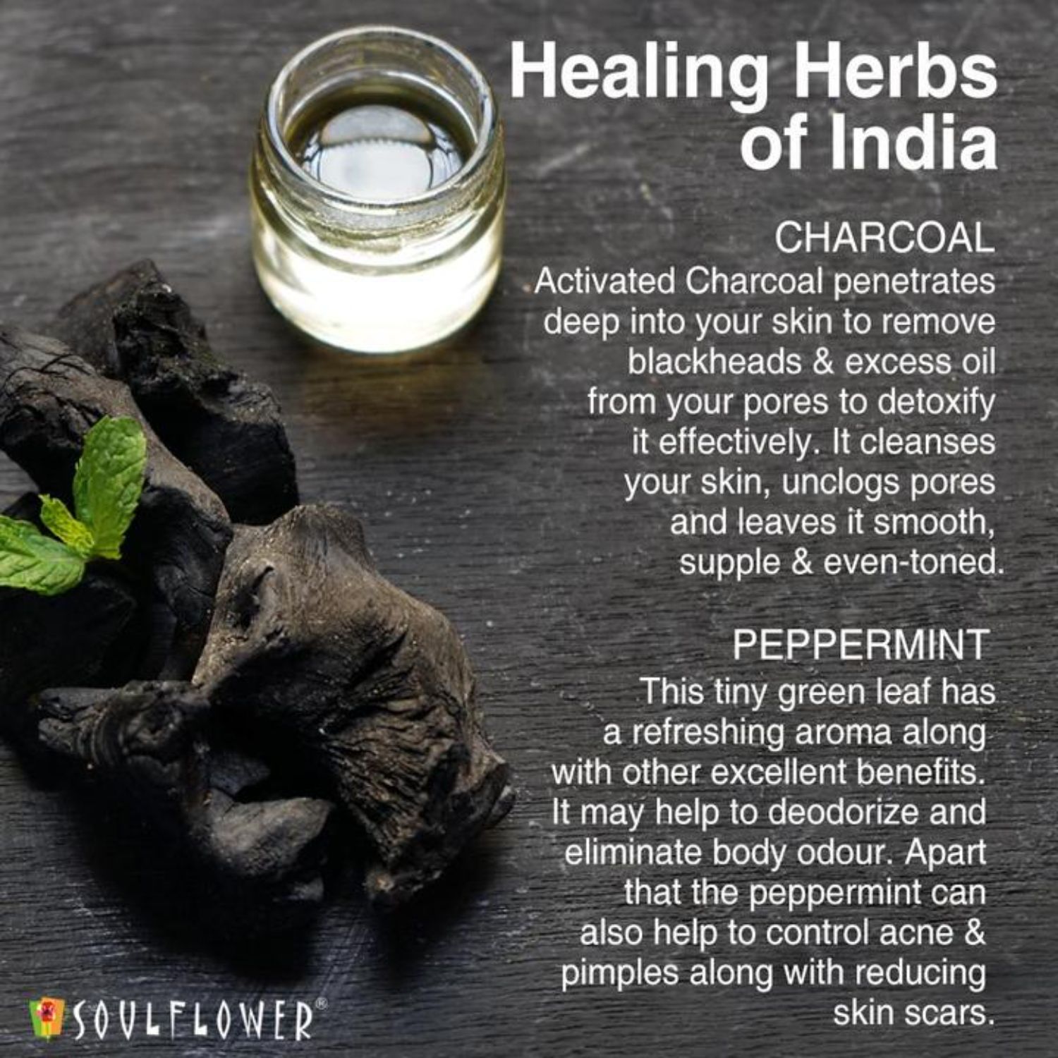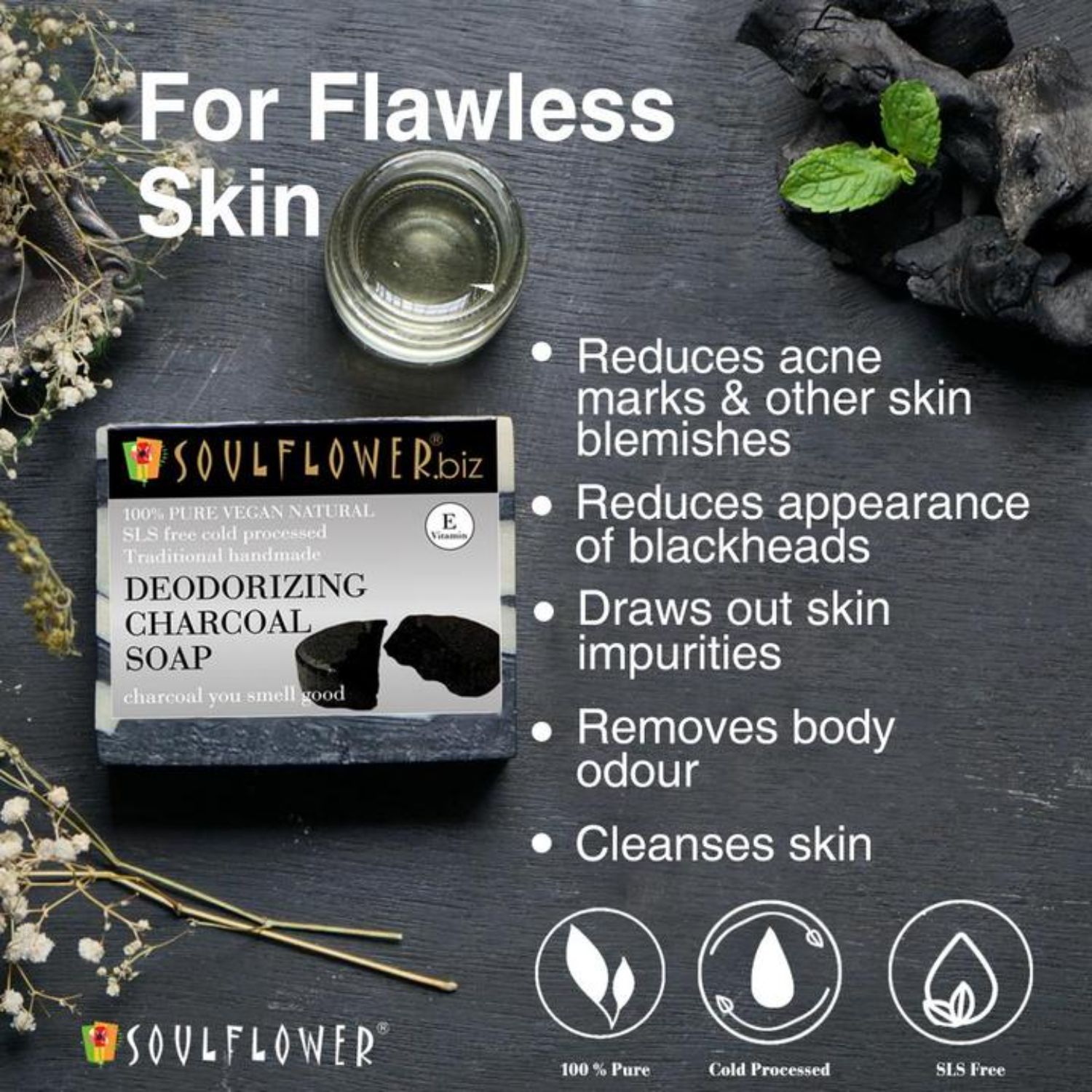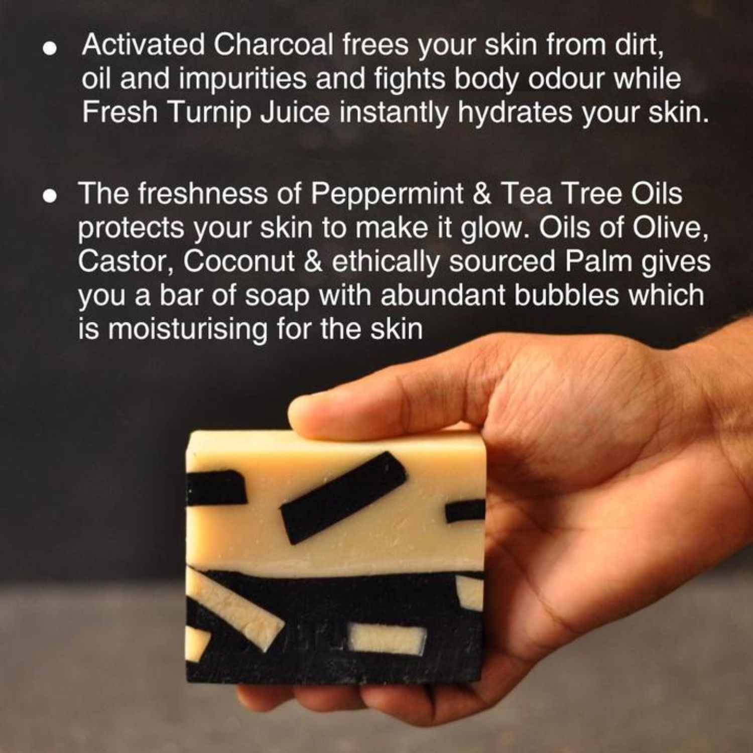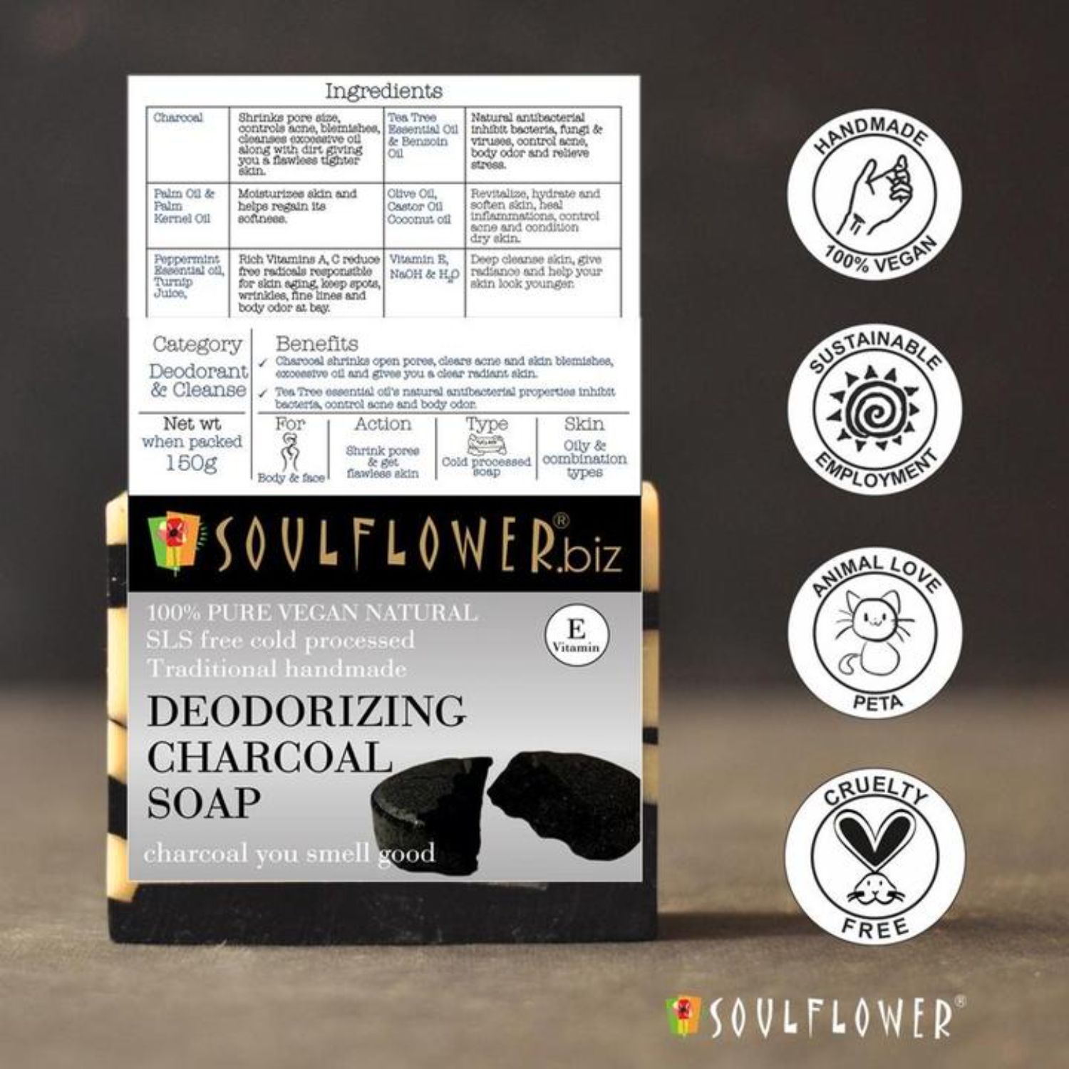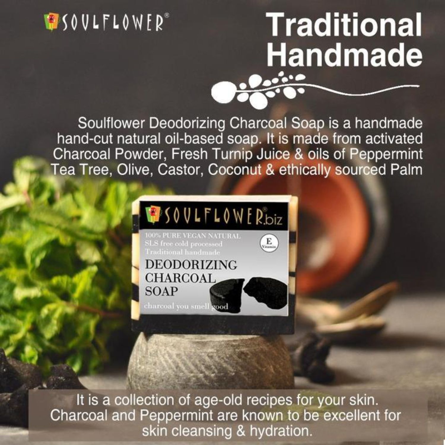 Cold-processed Soulflower Deodorizing Charcoal Soap is a handmade, hand-cut, natural oil-based soap. It is made from Activated Charcoal Powder, Fresh Radish Juice, essential oils of Peppermint and Tea tree, oils of Olive, Coconut, Castor and Palm with Vitamin E. Activated Charcoal frees your skin from dirt, oil and impurities and fights body odour while Fresh Radish Juice instantly hydrates your skin. The freshness of Peppermint and Tea Tree Oils protect your skin to make it glow. Lighten, brighten and energize your skin with the earthy and fresh aroma and soft fluffy lather of this soap.