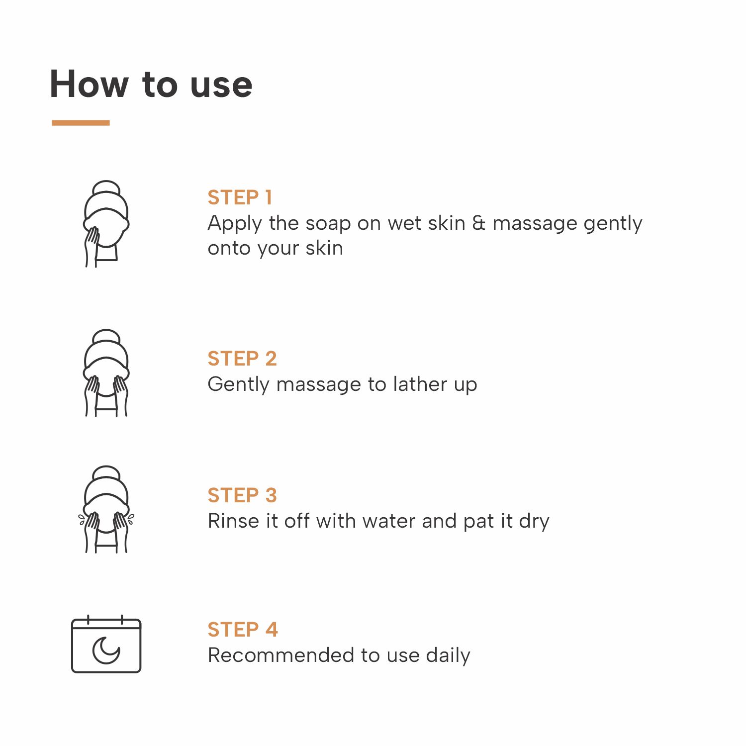 1. Apply the soap on wet skin 2. Gently massage to lather up