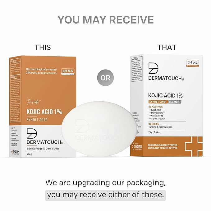DERMATOUCH Kojic Acid 1% soap helps to fix your skin from sun & environmental damage while brightening & rejuvenating the skin. The clinically proven actives inhibit melanin production which limits tyrosinase activity. It helps reduce pigmentation, dark spots & skin discoloration to brighten even skin tone. It is suitable for all skin types. The soap shields against skin damage and cleanses dirt & any impurities while protecting it from free radicals, sun damage & sun spots. Also, it helps to reduce dullness & improve the radiance of the skin.