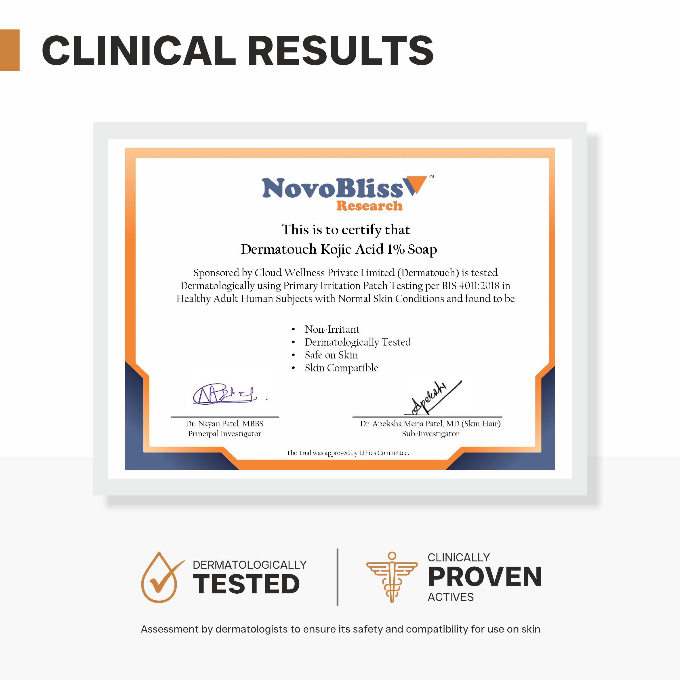 DERMATOUCH Kojic Acid 1% soap helps to fix your skin from sun & environmental damage while brightening & rejuvenating the skin. The clinically proven actives inhibit melanin production which limits tyrosinase activity. It helps reduce pigmentation, dark spots & skin discoloration to brighten even skin tone. It is suitable for all skin types. The soap shields against skin damage and cleanses dirt & any impurities while protecting it from free radicals, sun damage & sun spots. Also, it helps to reduce dullness & improve the radiance of the skin.