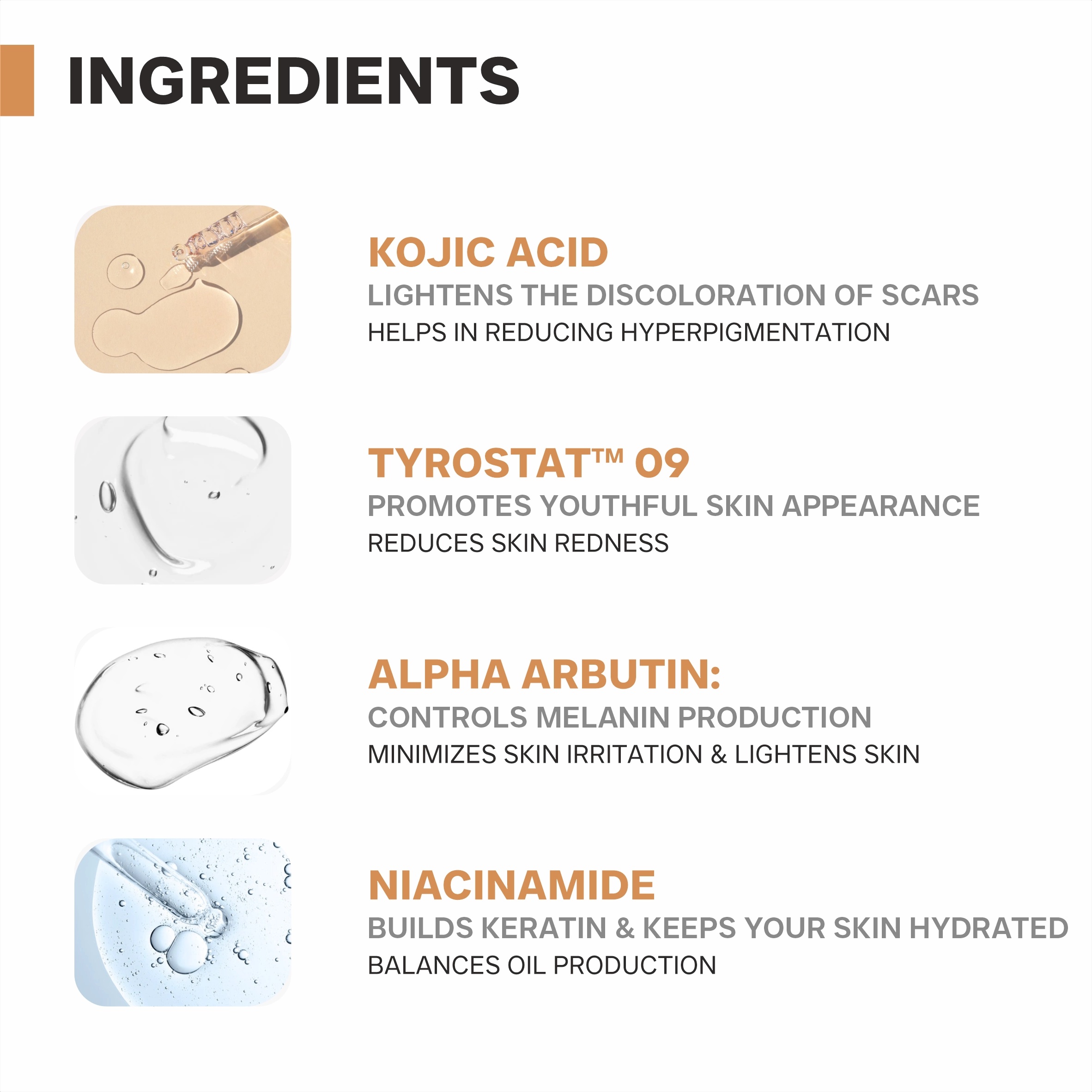 Aqua, Niacinamide PC, Caprylic/Capric Triglyceride, Almond oil, Glycerine, Kojic Acid Dipalmitate, Lecigel, Alpha Arbutin, Phenoxyethanol (and) Ethylhexylglycerin, Vitamin E, Butylated Hydroxytoluene, Disodium EDTA, Tyrostat-09, Fragrance (IFRA Certified Allergen Free Fragrance)