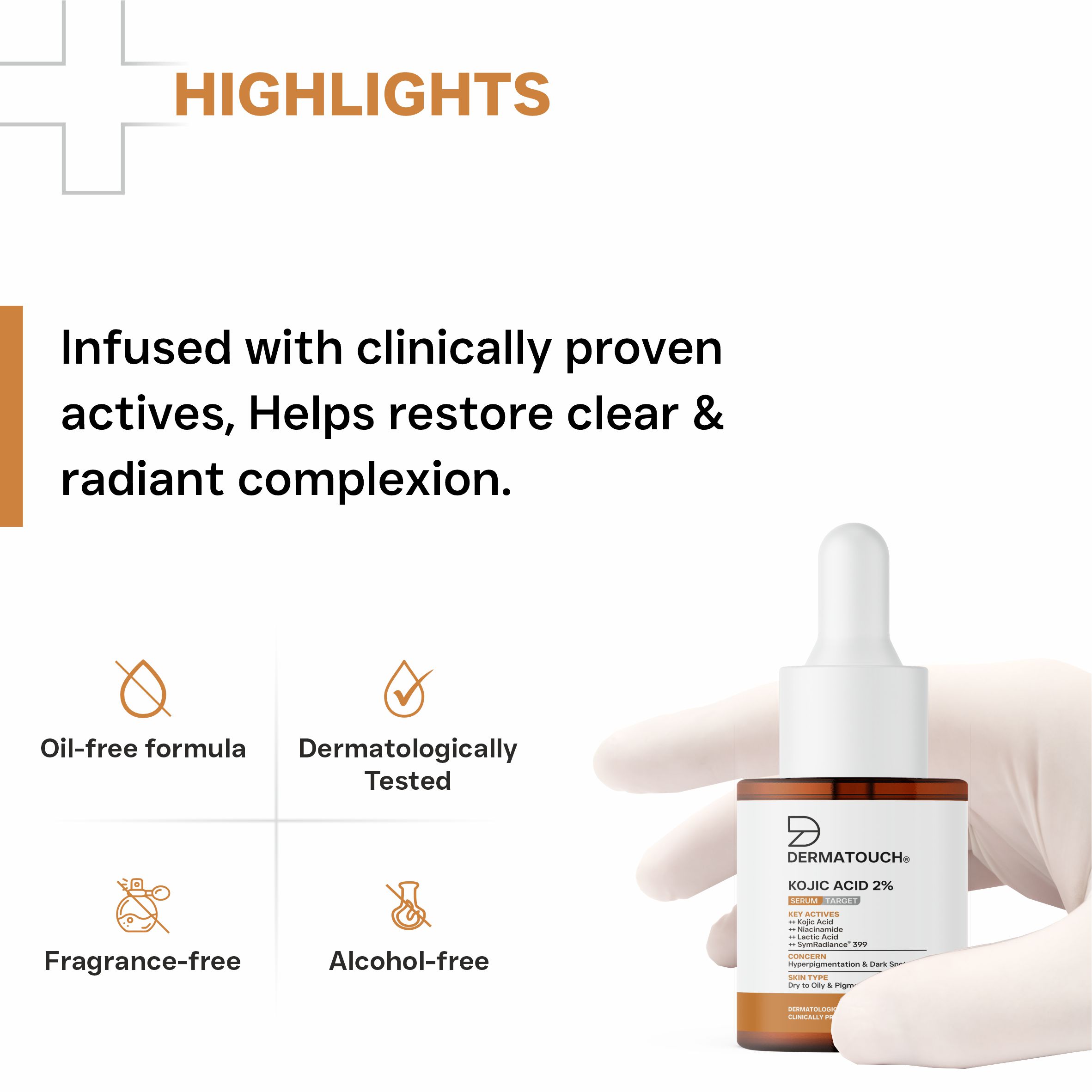 DERMATOUCH Kojic Acid 2% Serum helps to brighten and even out the skin tone while reducing pigmentation and dark spots. The clinically proven active inhibits melanin production, targeting pigmentation, dark spots, and uneven skin tone for a clearer and radiant complexion. It also consist Niacinamide and Lactic Acid that soothe, and protect the skin while improving overall skin radiance and texture. It is lightweight and non-sticky formula that keeps your skin hydrated for longer time.