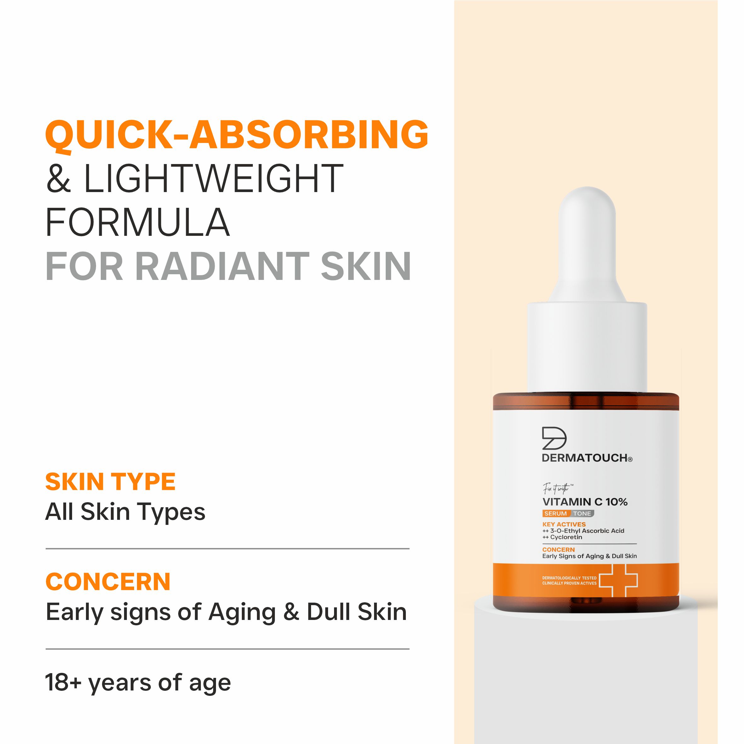 Dermatouch Vitamin C 10% Serum with Cycloretin is a powerful anti-aging formula designed to brighten, firm, and rejuvenate the skin. The advanced Vitamin C complex enhances radiance and reduces pigmentation, while Cycloretin boosts collagen, improving firmness and elasticity. It combats dullness, fine lines, and environmental damage to reveal smoother, even-toned, and youthful-looking skin. Suitable for all skin types.