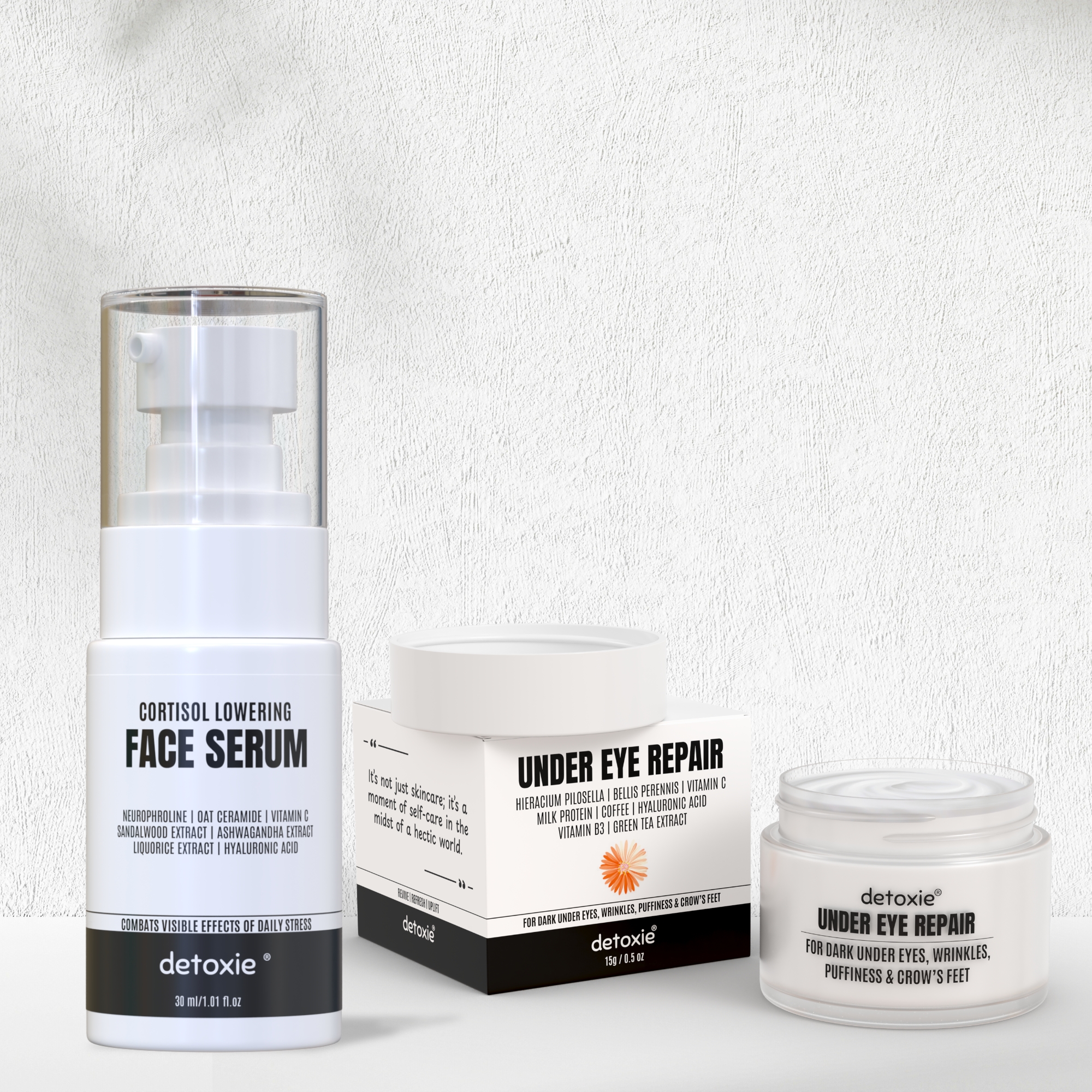 Introducing a powerful duo in the Lip Care category, formulated to combat dark circles and lower cortisol for a refreshed, radiant look. Perfect for daily use, this combo pairs a 30 ml cortisol-lowering serum with a 15g under-eye cream to hydrate, brighten, and soothe the delicate eye area. Its lightweight, fast-absorbing formulas reduce puffiness and stress-related skin concerns, delivering a youthful glow. Designed for those seeking targeted eye and stress relief, its innovative blend addresses the need for a holistic solution that rejuvenates.