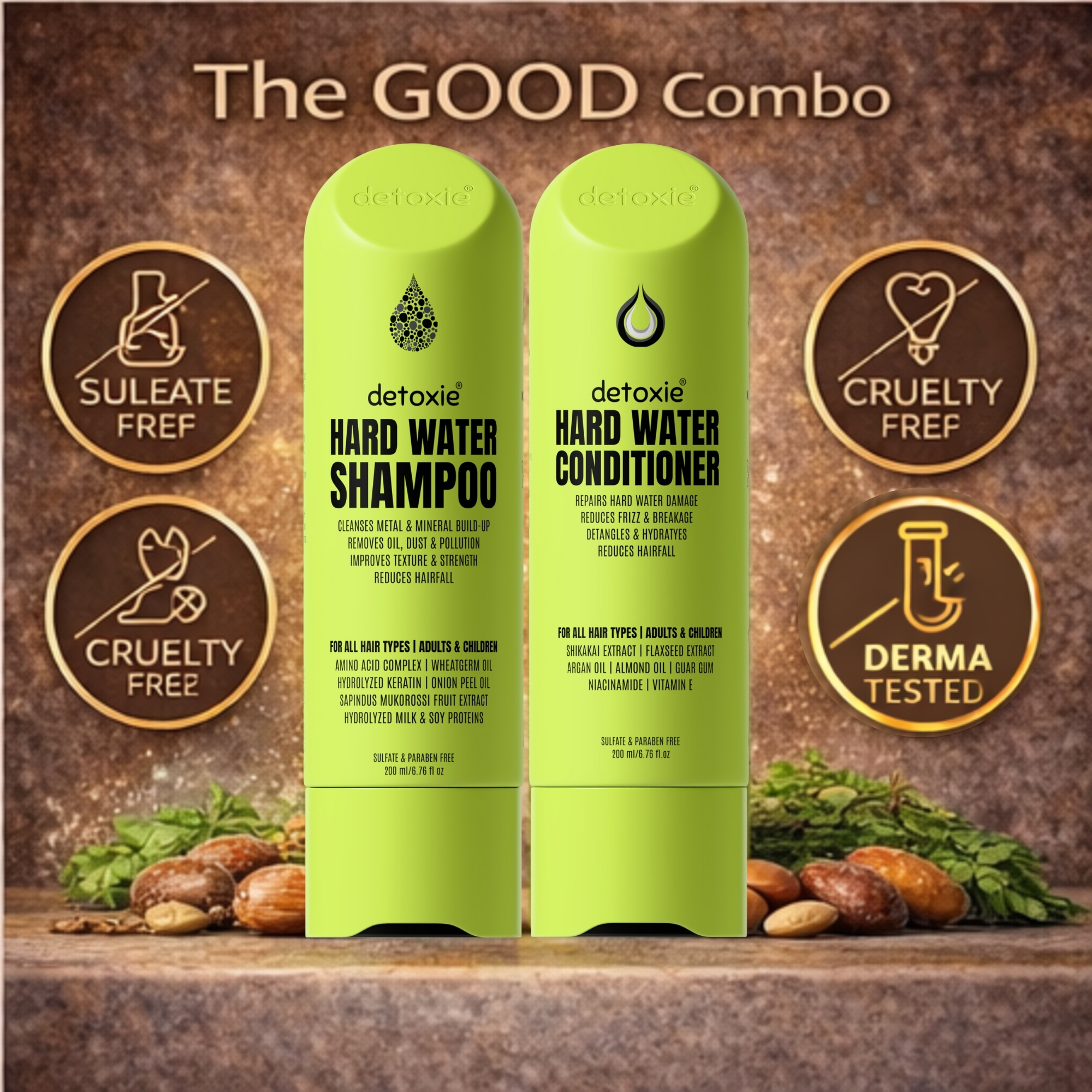 A hard water repair shampoo & a deeply nourishing conditioner, that together, try & reverse the damage caused due to hard water. The shampoo a clarifying shampoo, with Amino Acid Complex, Wheatgerm Oil , Hydrolyzed Keratin, Onion Peel Oil, Sapindus Mukorossi Fruit Extract, Hydrolyzed Milk & Soy Proteins and other ingredients that work on cleansing and reducing hairfall. The conditioner is enriched with Flaxseed Extract, Argan Oil, Almond Oil, Guar Gum, Niacinamide, Vitamin E.